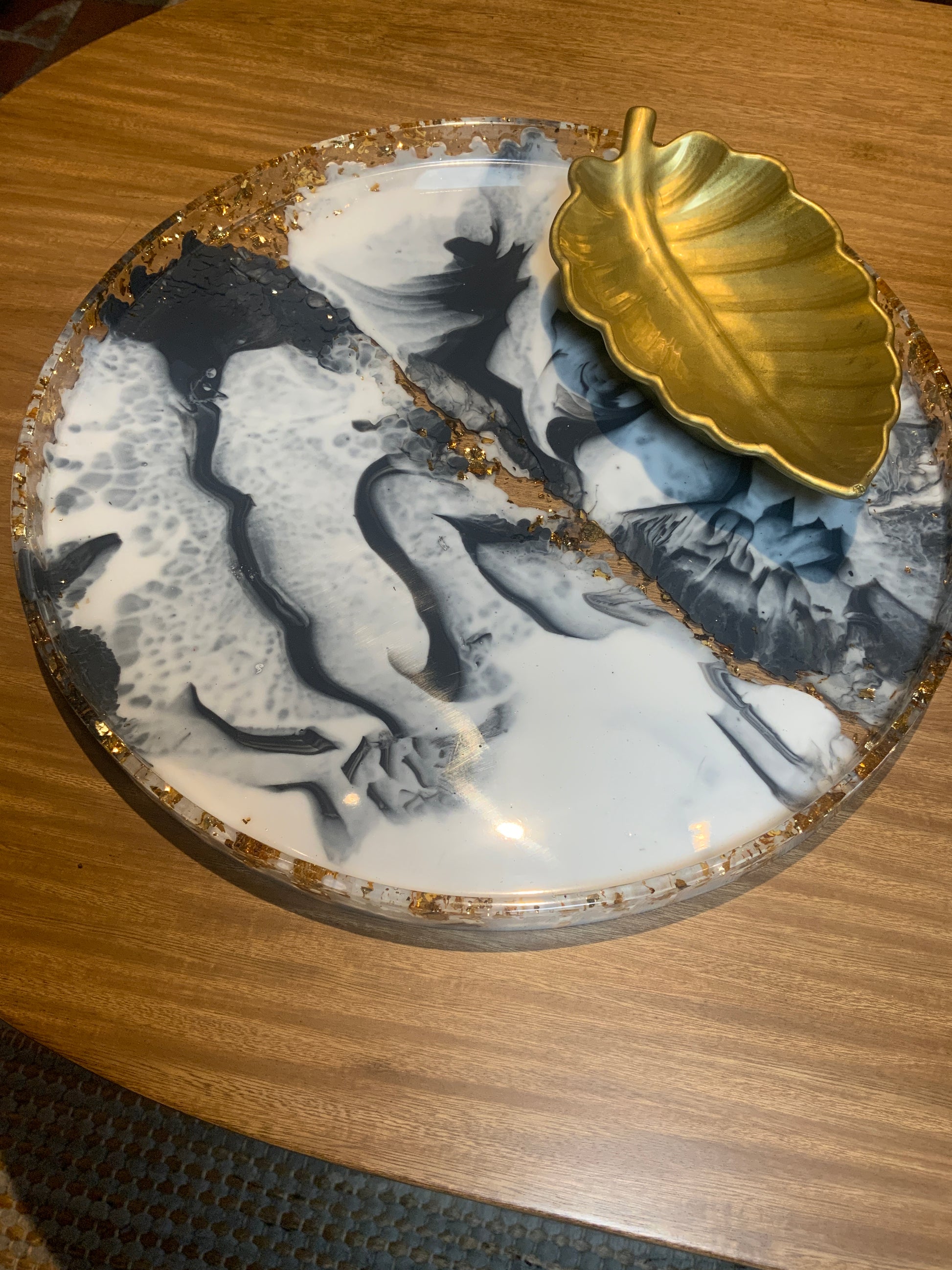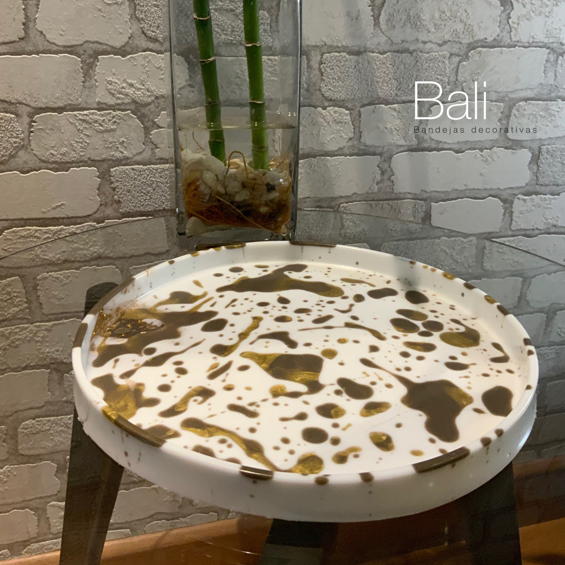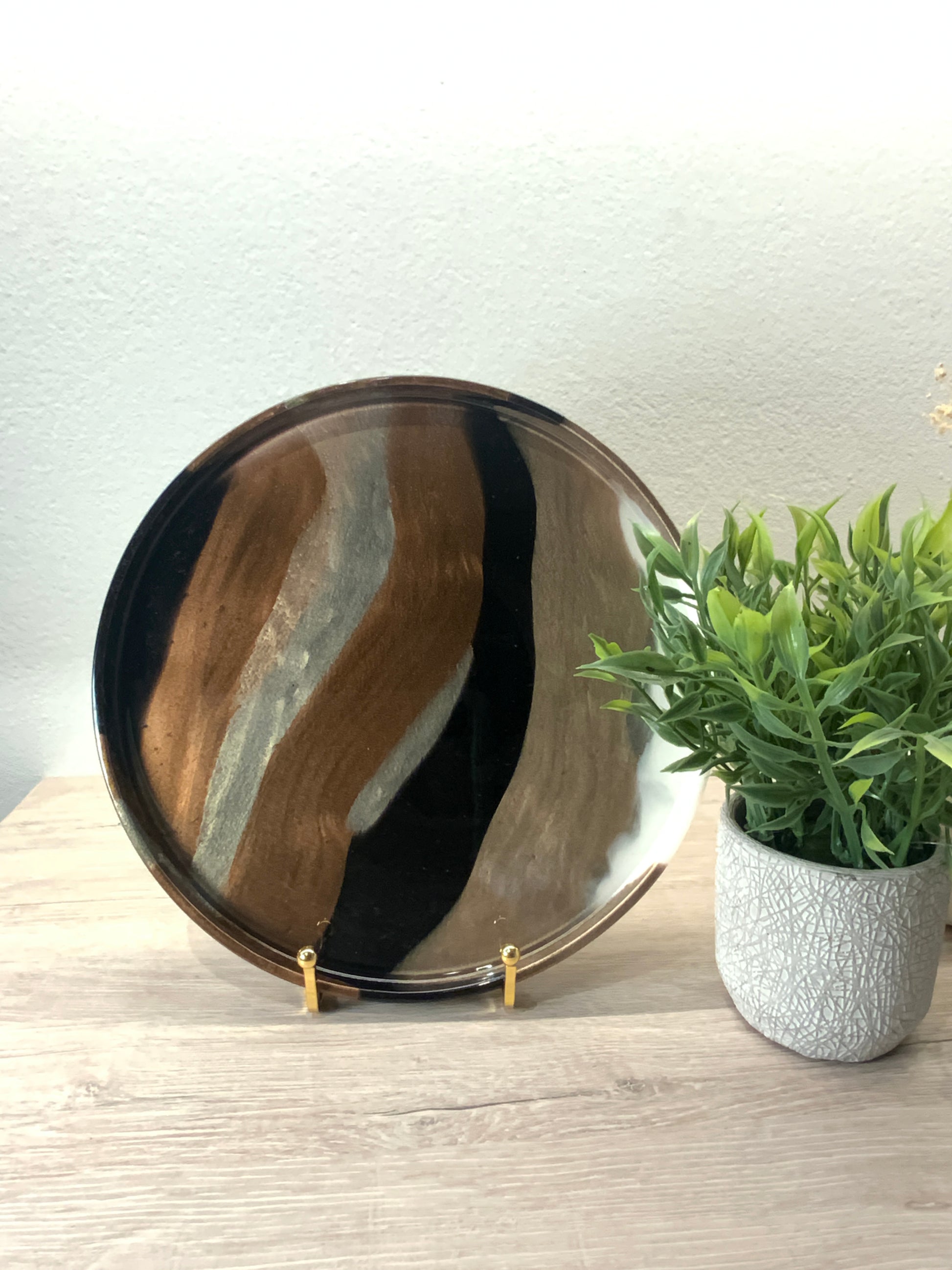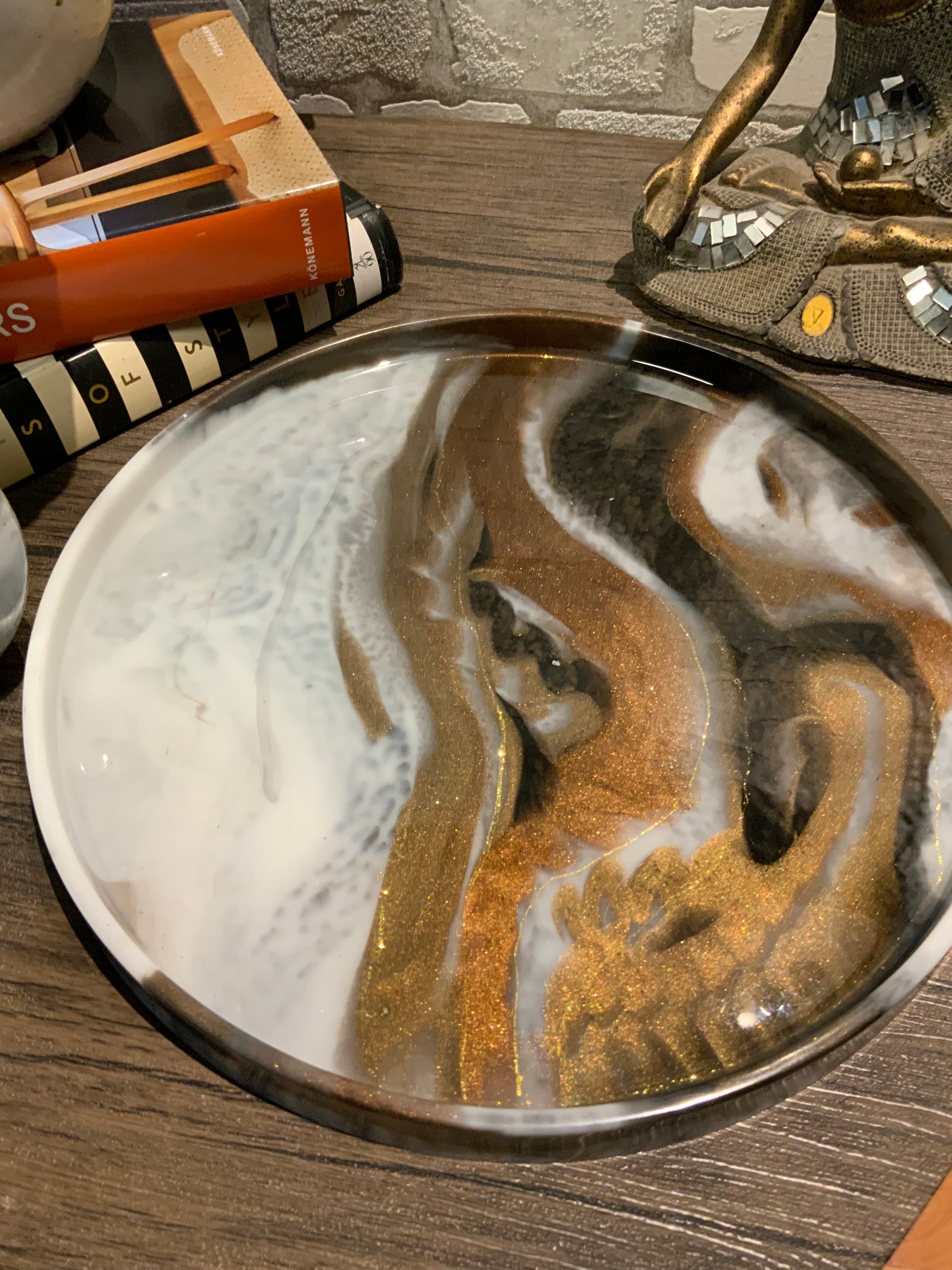 Hermosa bandeja DECORATIVAS en Resina, en la combinación de colores de tu elección. Esta bandeja tienen varios diseños como pigmentos que simulan gotas y otras con diseños clásicos con colores que regalan paz y tranquilidad a tu hogar.