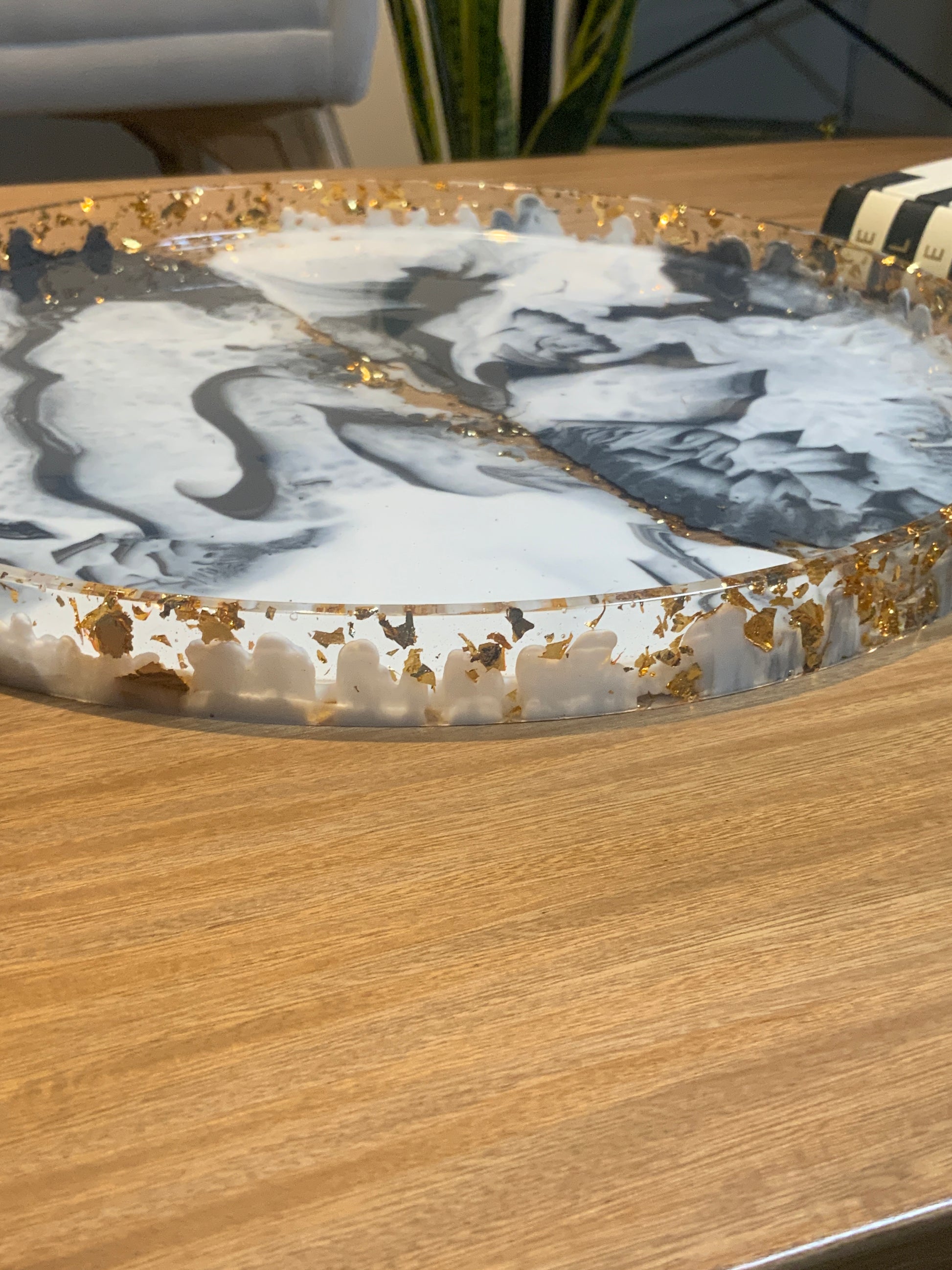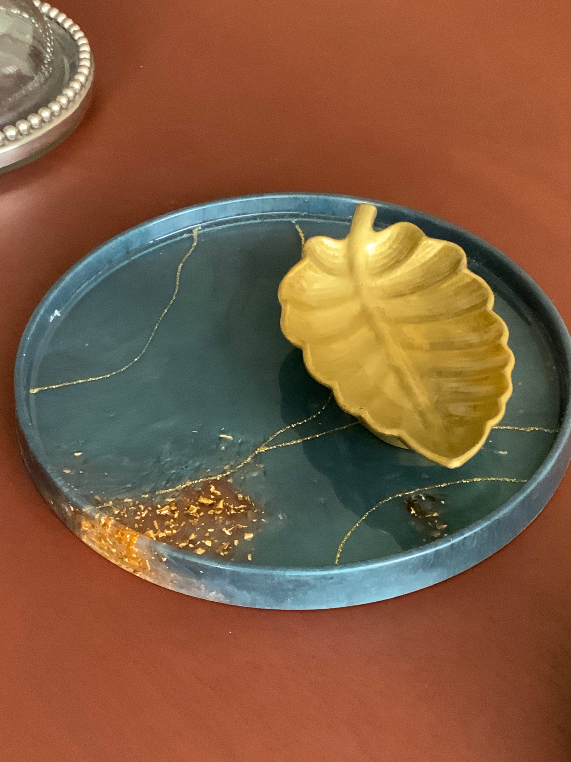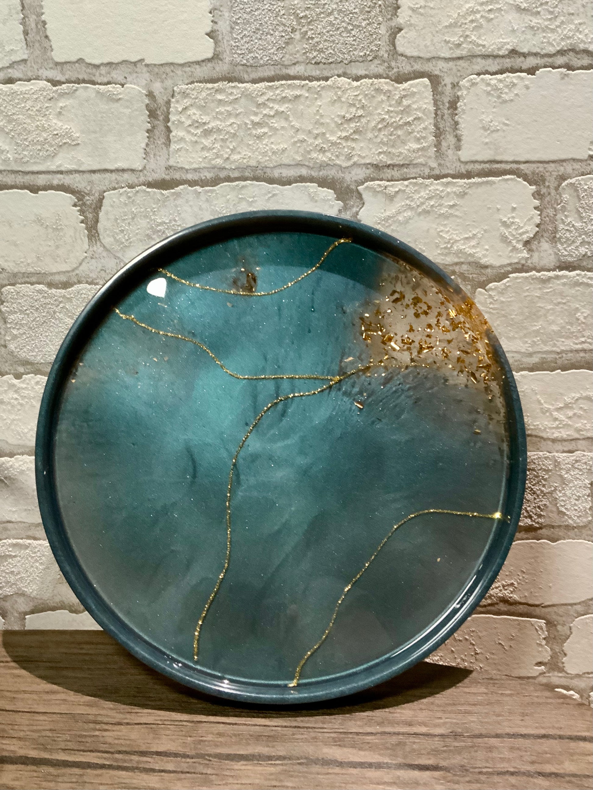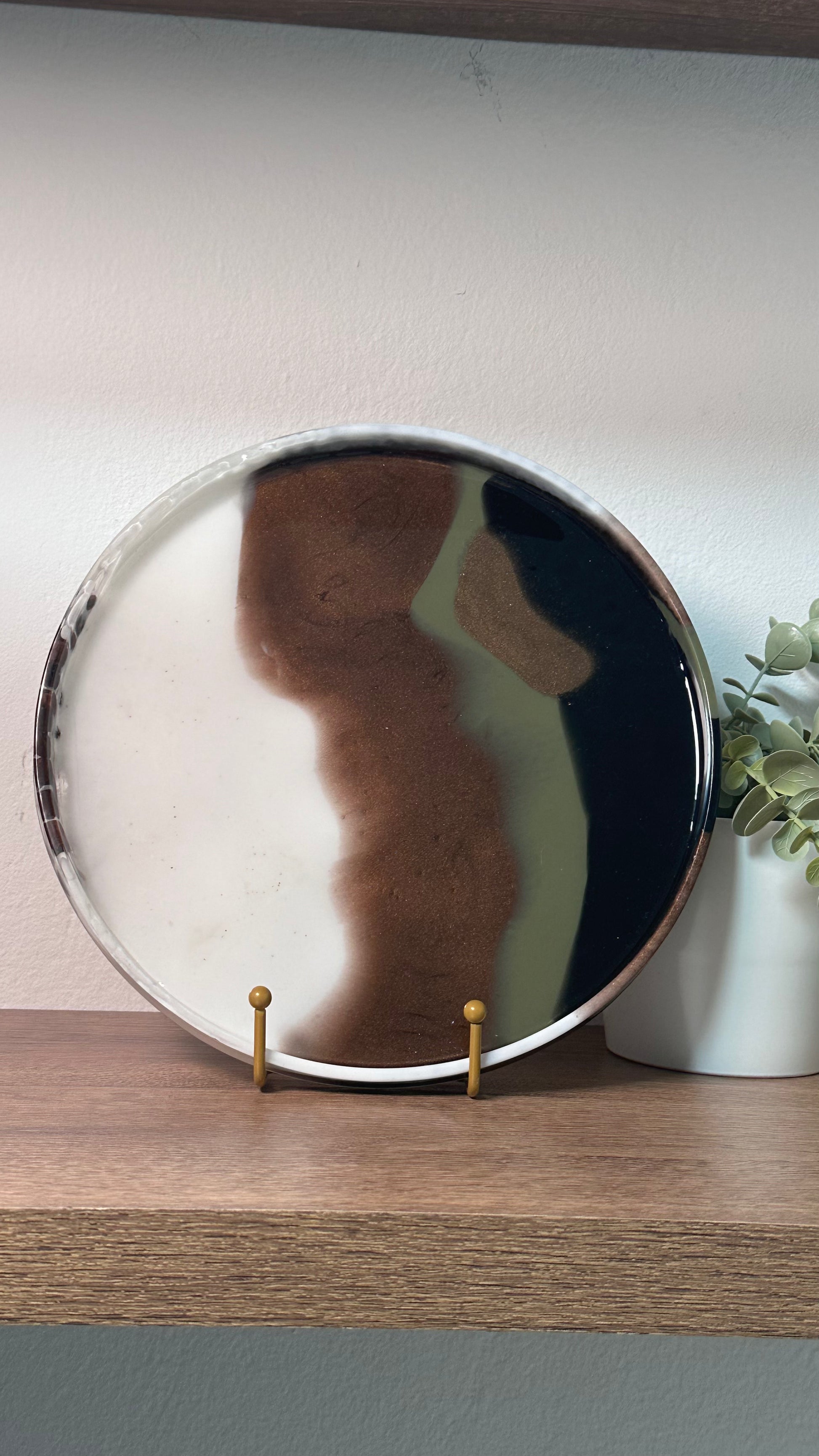 Hermosa bandeja DECORATIVAS en Resina, en la combinación de colores de tu elección. Esta bandeja tienen varios diseños como pigmentos que simulan gotas y otras con diseños clásicos con colores que regalan paz y tranquilidad a tu hogar.