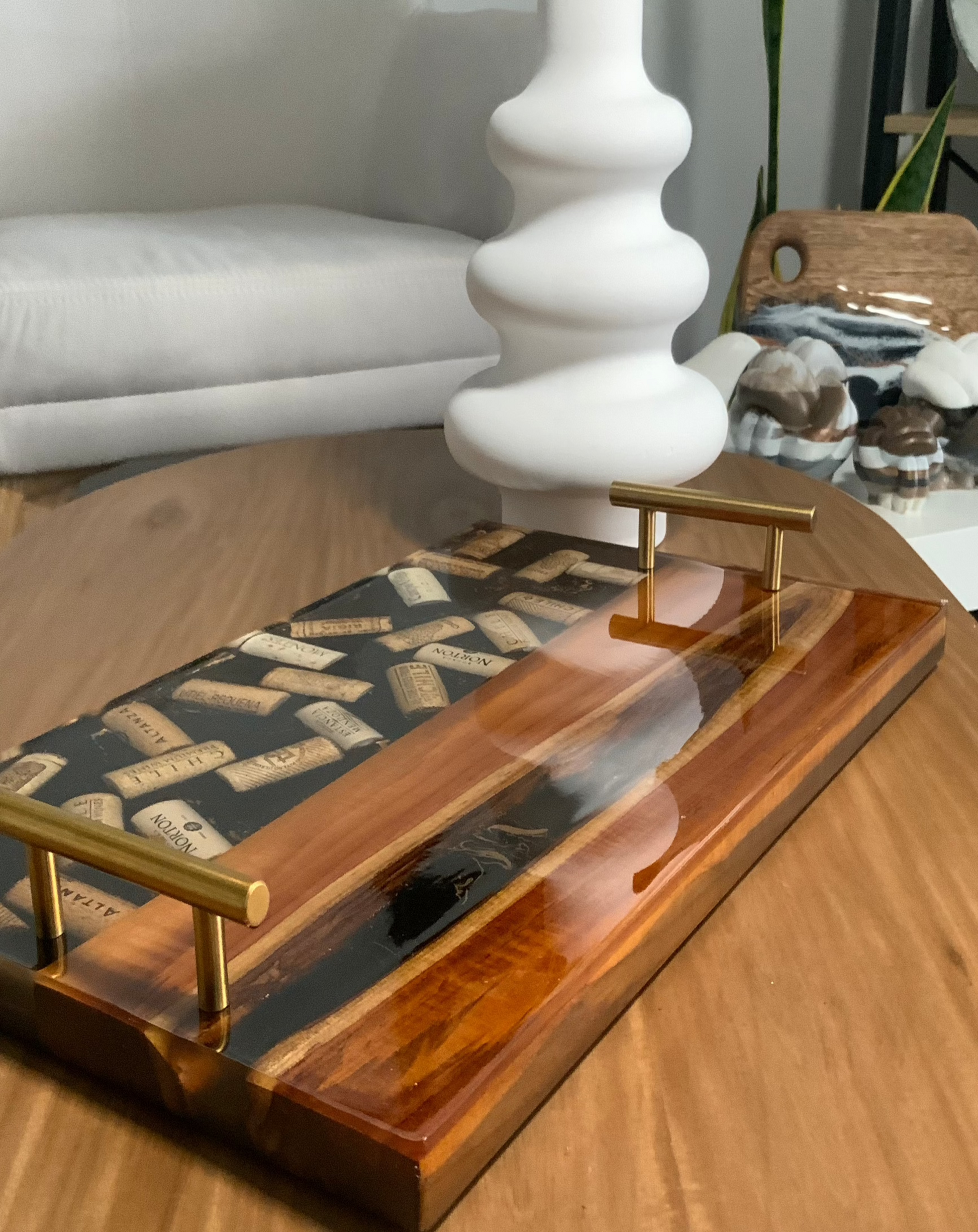 Material: Resina Epóxica de profundidad, Madera Teka, Corchos reales, Asas de Lujo