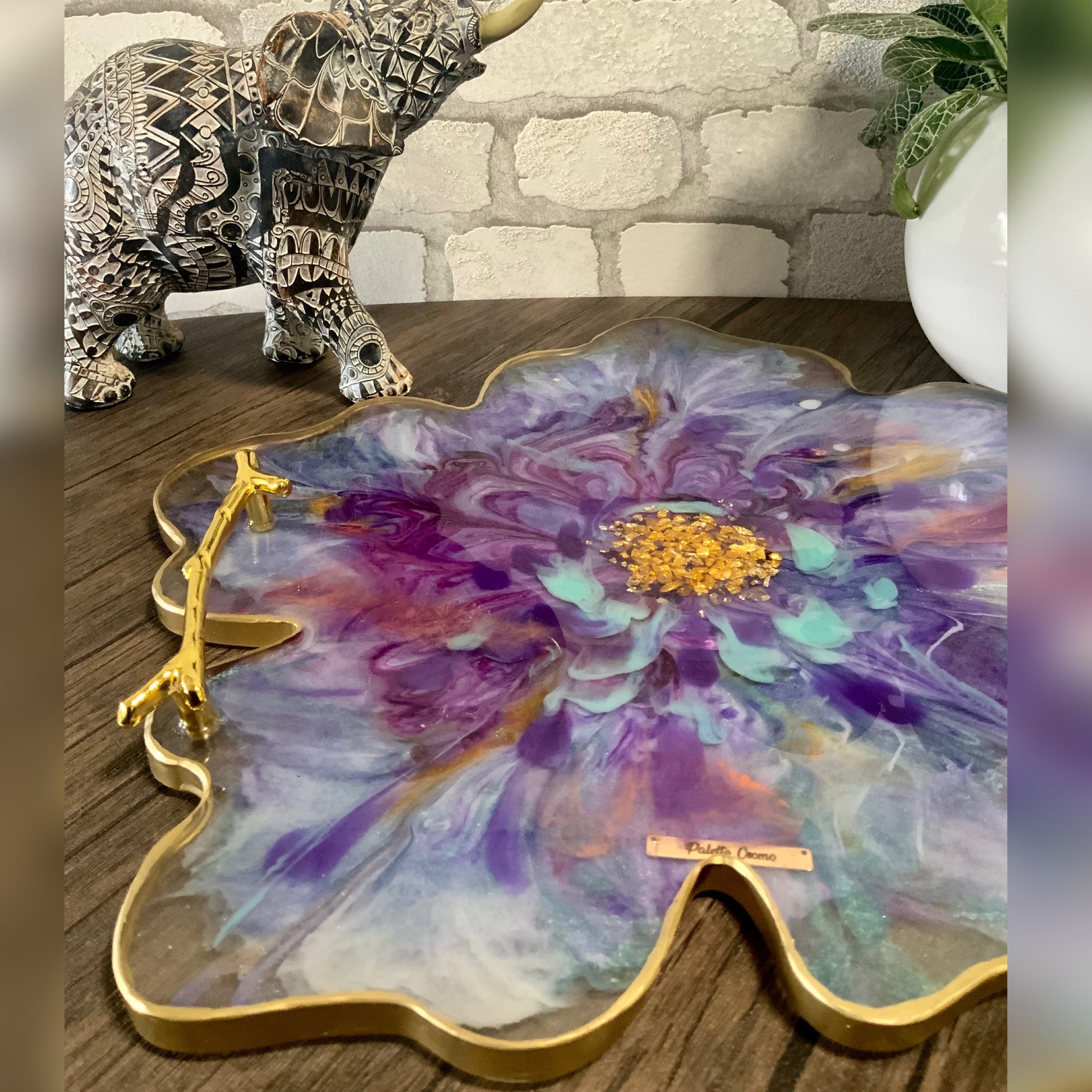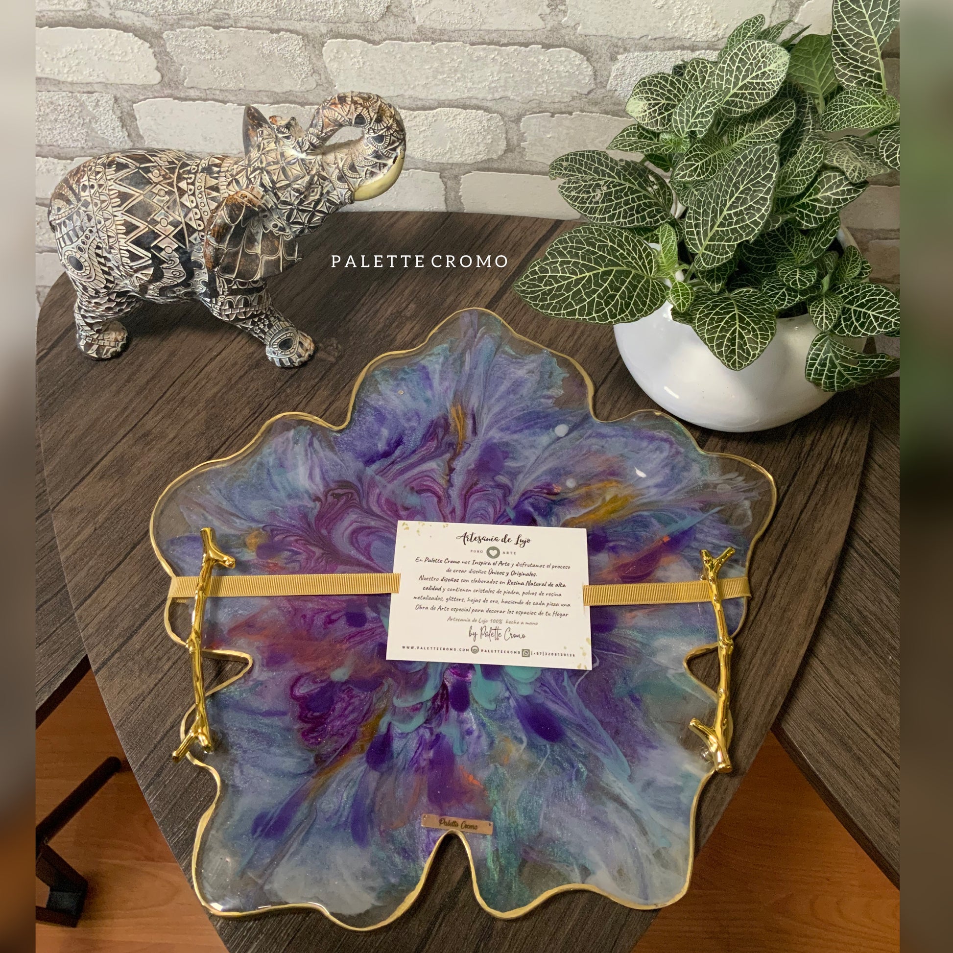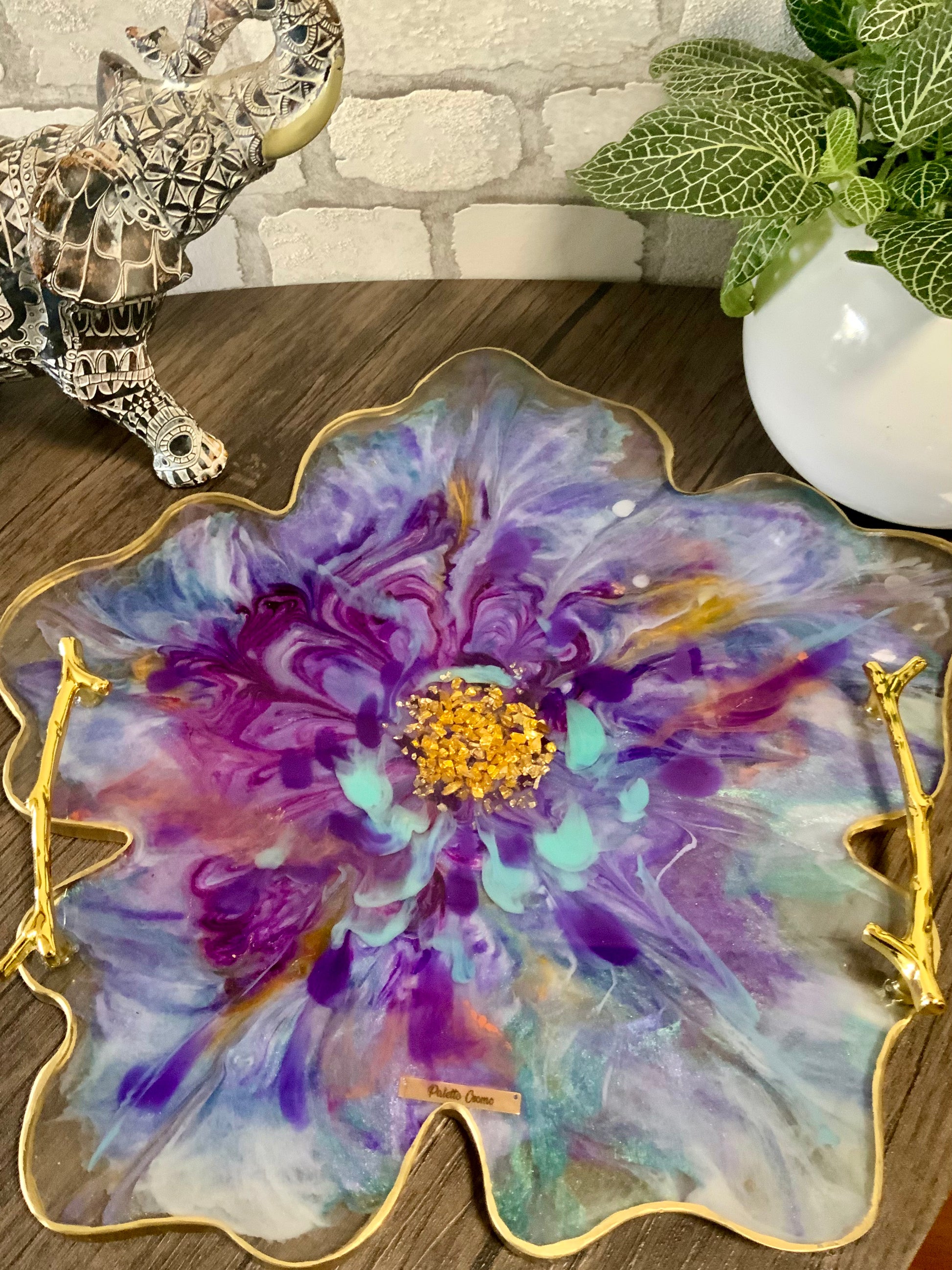 Lujosas Bandejas en Resina Forma de Flor Irregular que emulan la belleza de las flores💐. Esta bandeja Cromática es elaborada bajo una técnica de Fluid Art para lograr los efectos de colores en ella, en el centro lleva un toque con hojas en color oro metalizado y piedras doradas.