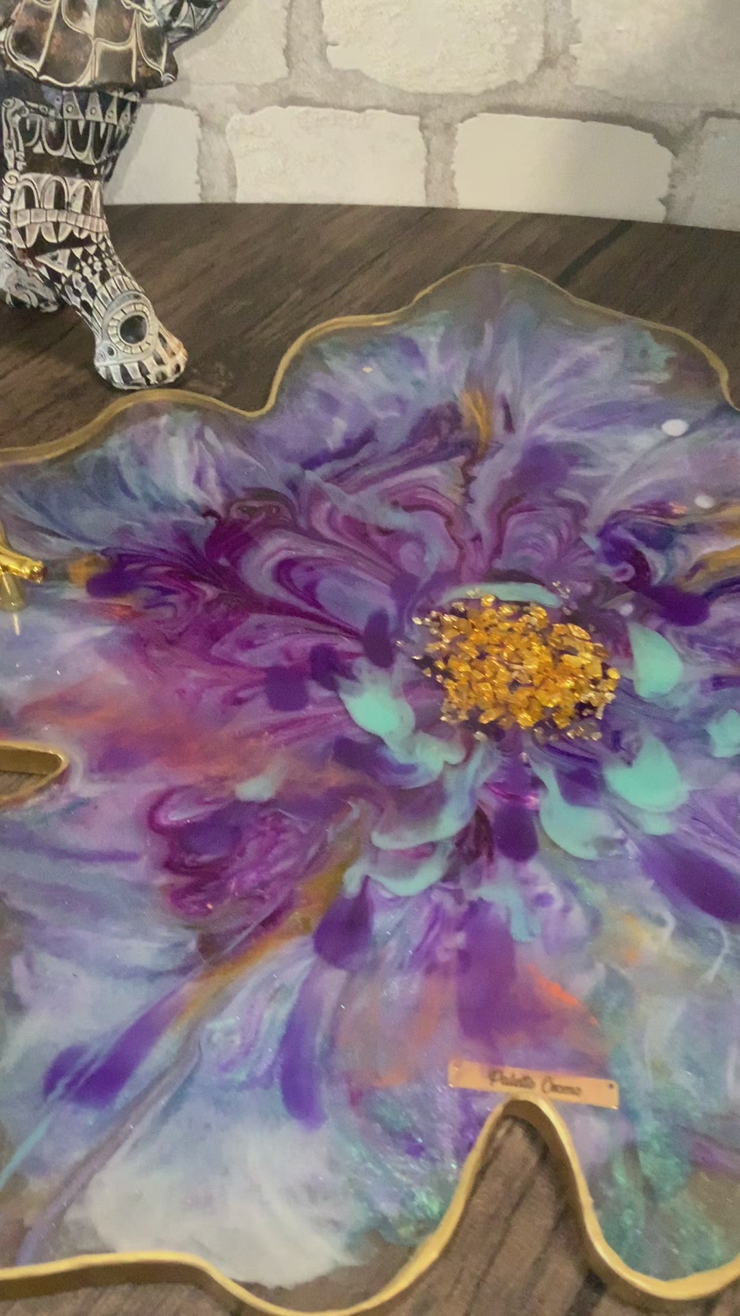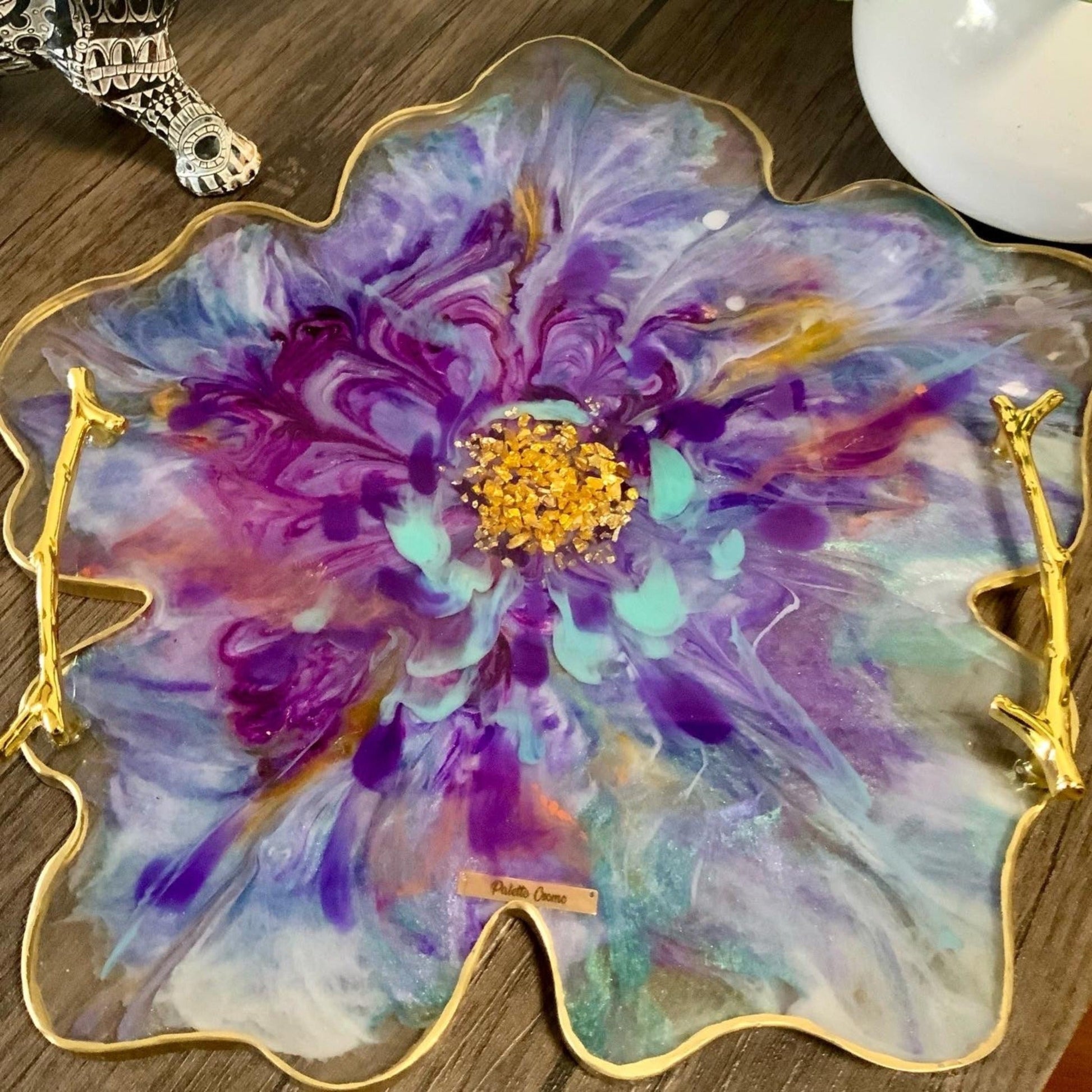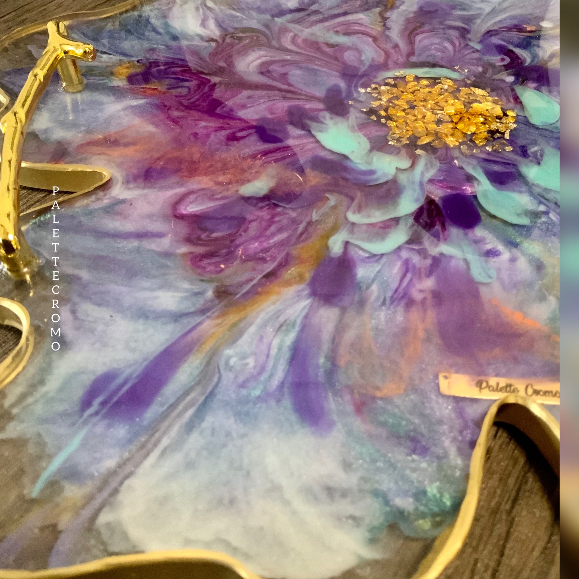 Lujosas Bandejas en Resina Forma de Flor Irregular que emulan la belleza de las flores💐. Esta bandeja Cromática es elaborada bajo una técnica de Fluid Art para lograr los efectos de colores en ella, en el centro lleva un toque con hojas en color oro metalizado y piedras doradas.