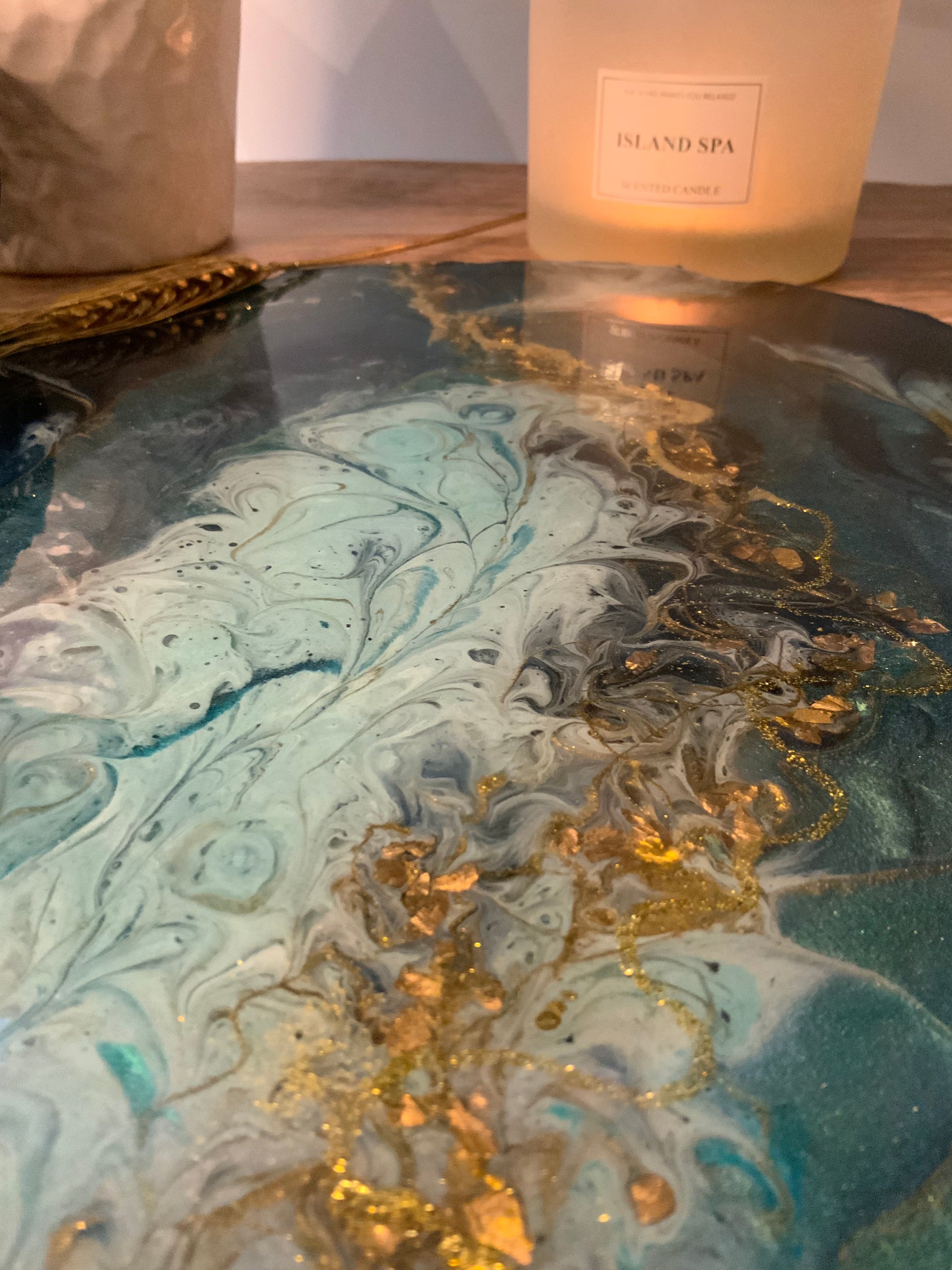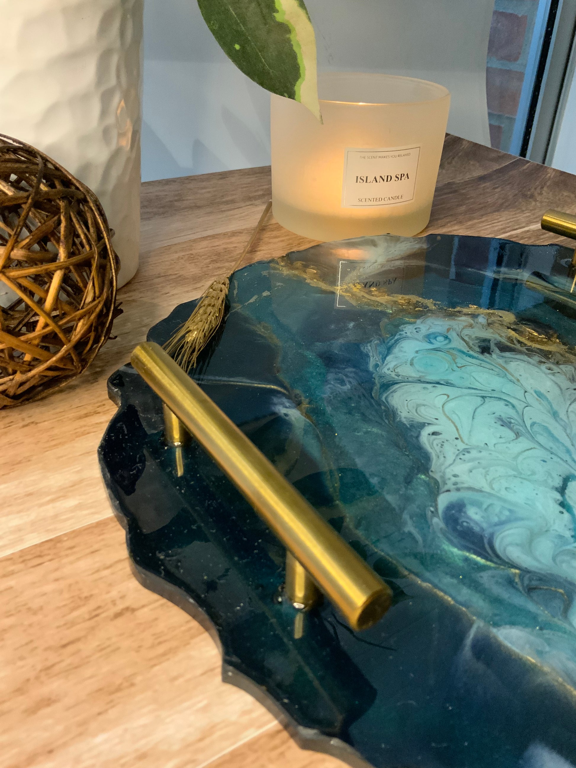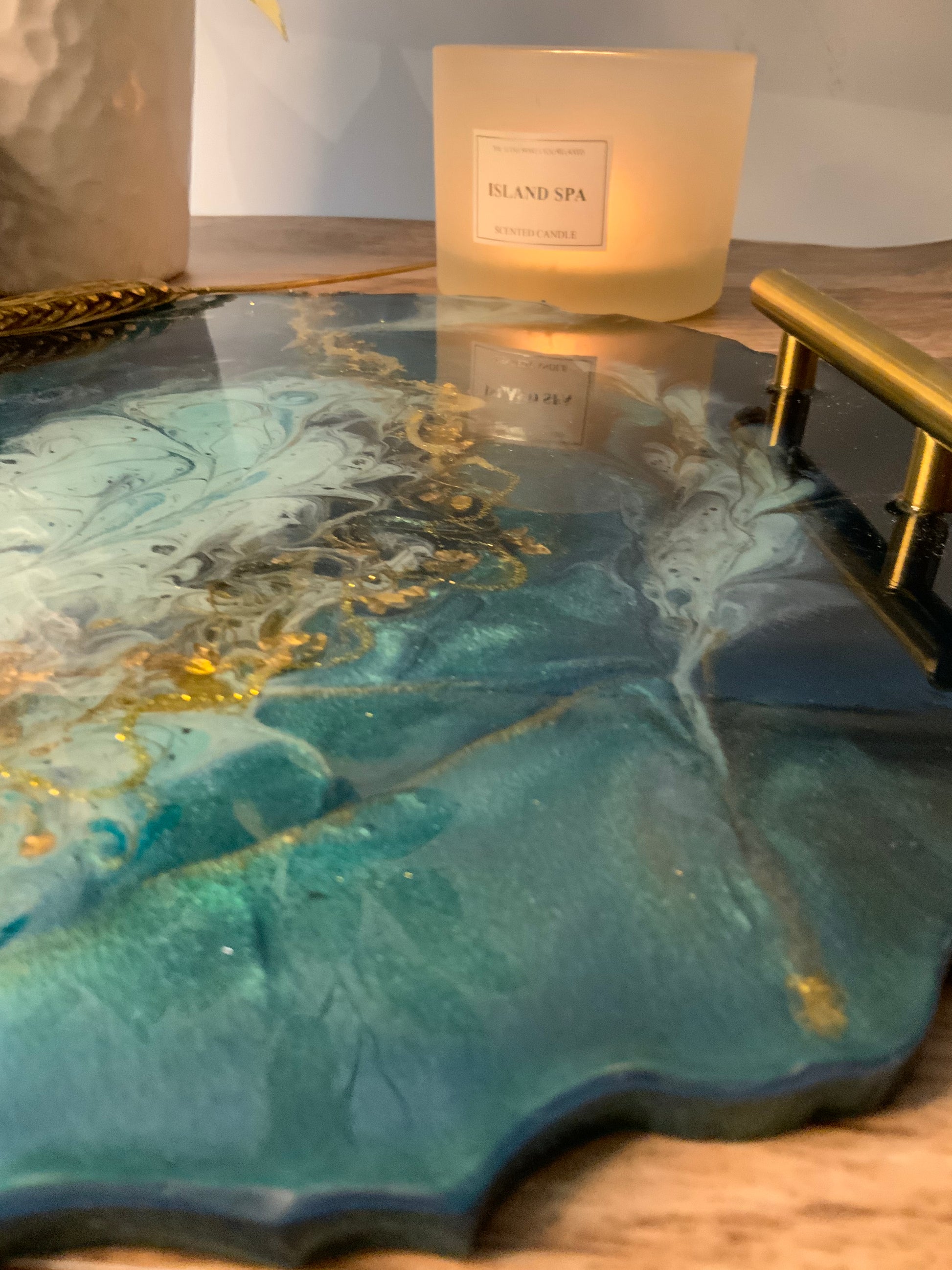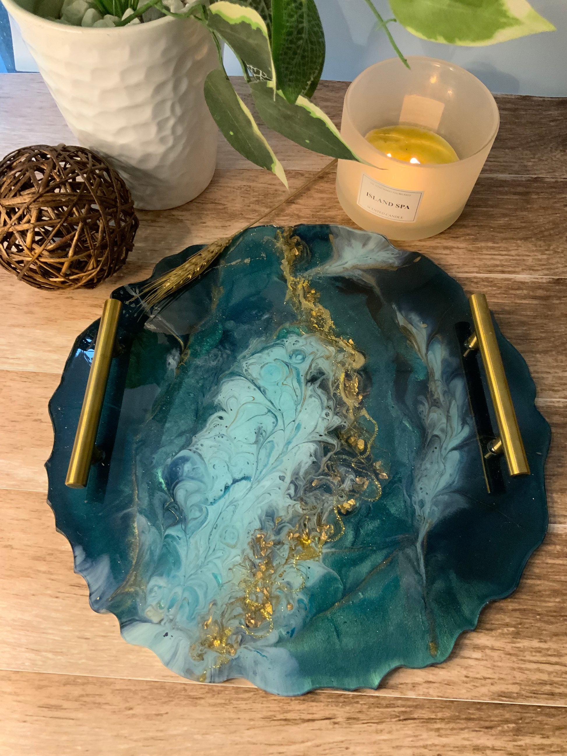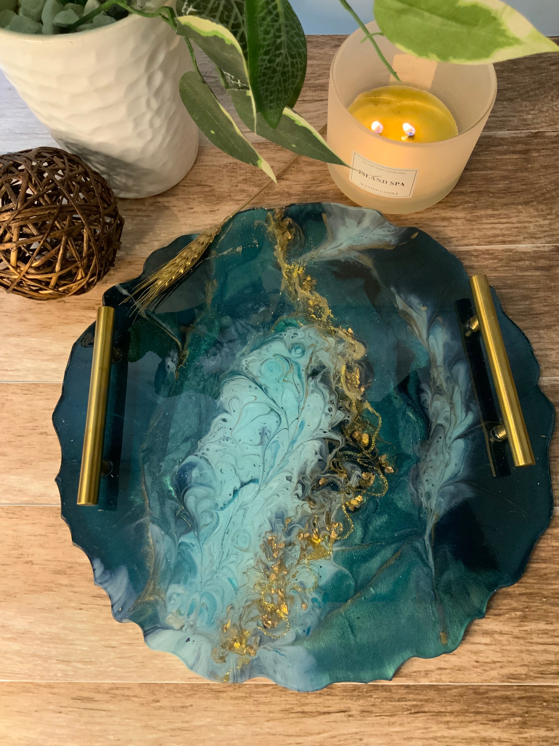 Hermosa bandeja en RESINA colores verdes y dorados. Esta bandeja esta decorada con piedras y cristales en el centro simulando un río de oro. Sus manillas son de acero inoxidable.