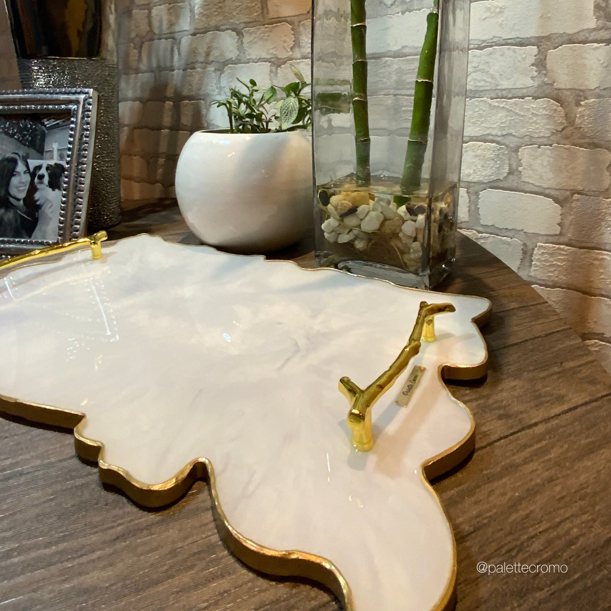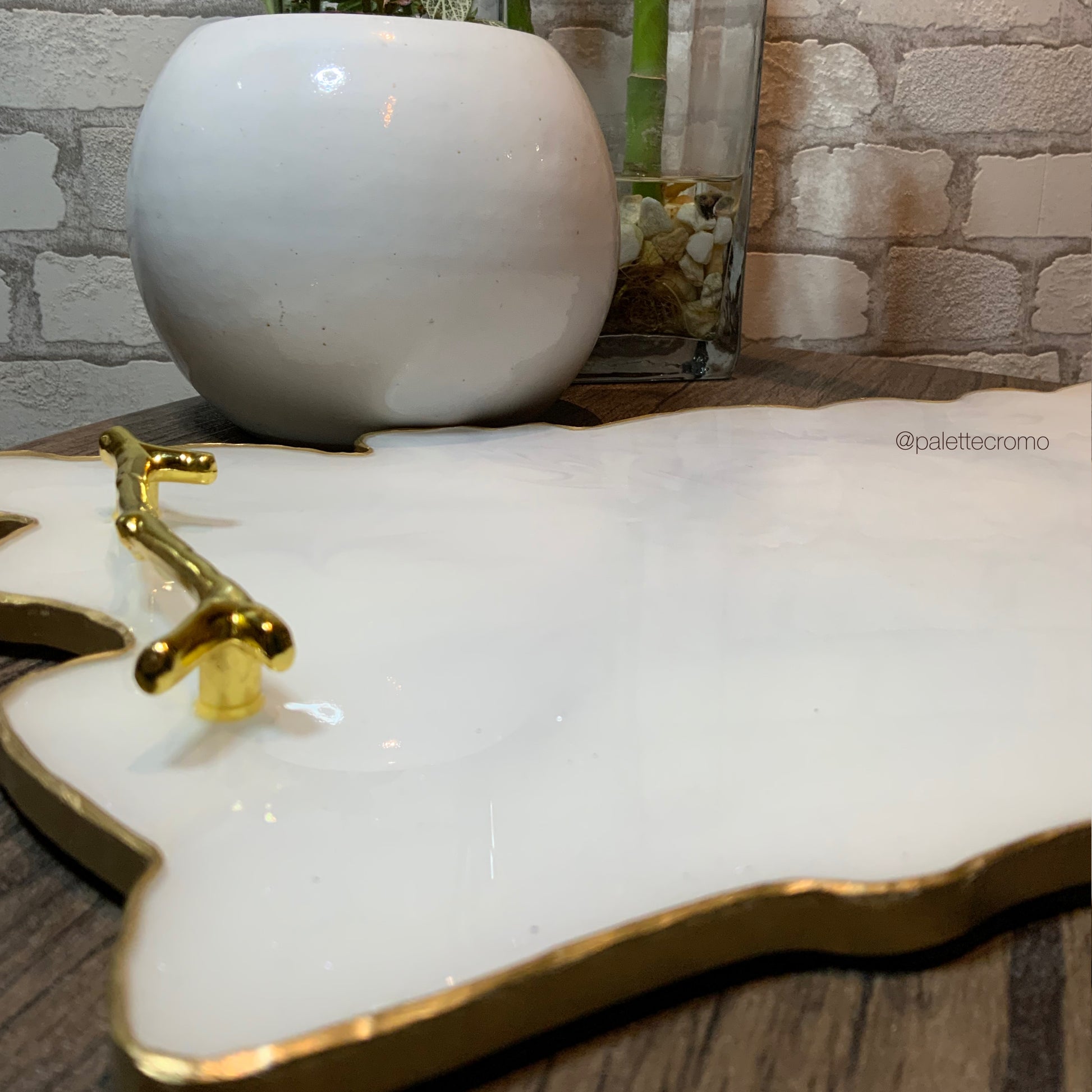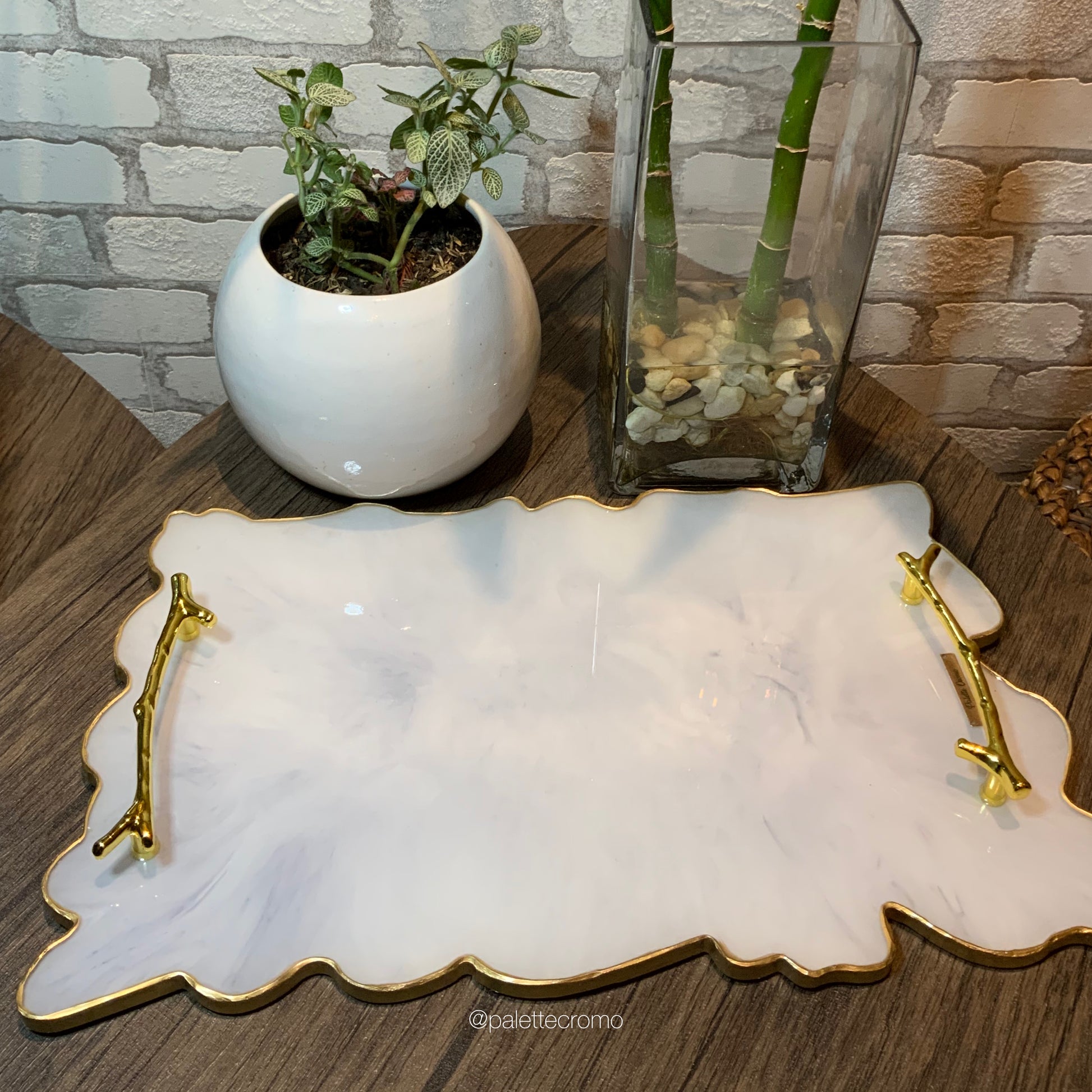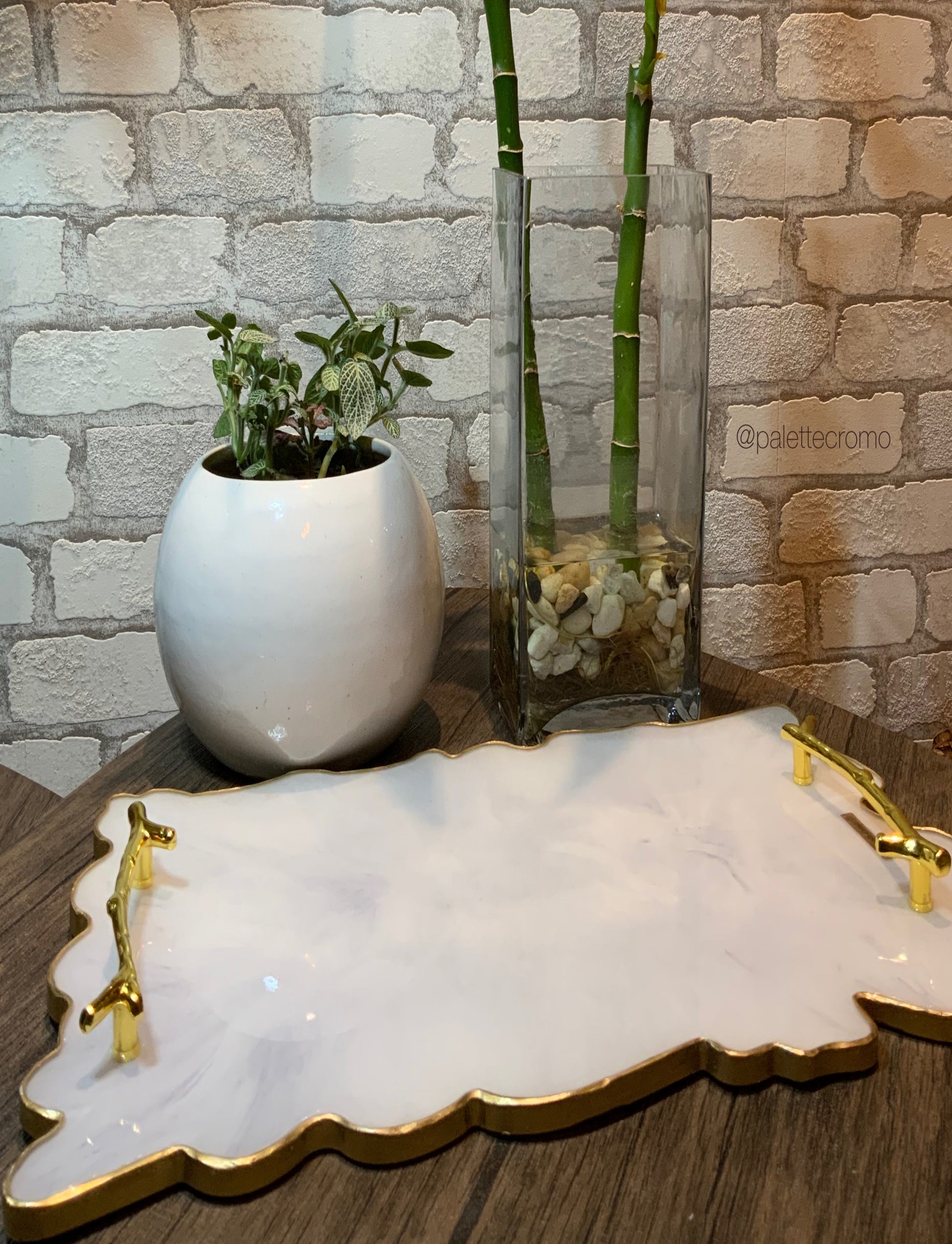 Lujosas Bandejas en Resina Forma Irregular que emulan la belleza del Mármol en color Blanco con vetas sutiles en Gris Light. Estos diseños llevan bordes en color oro metalizado.