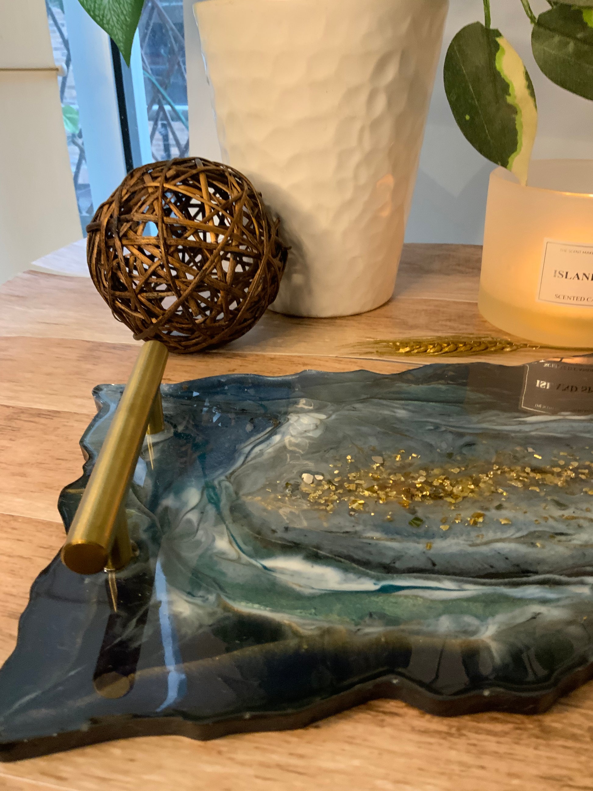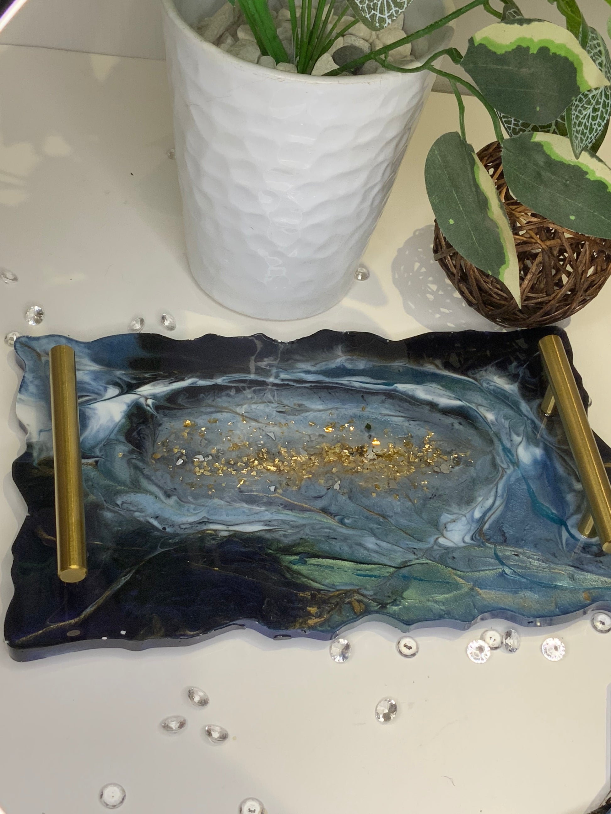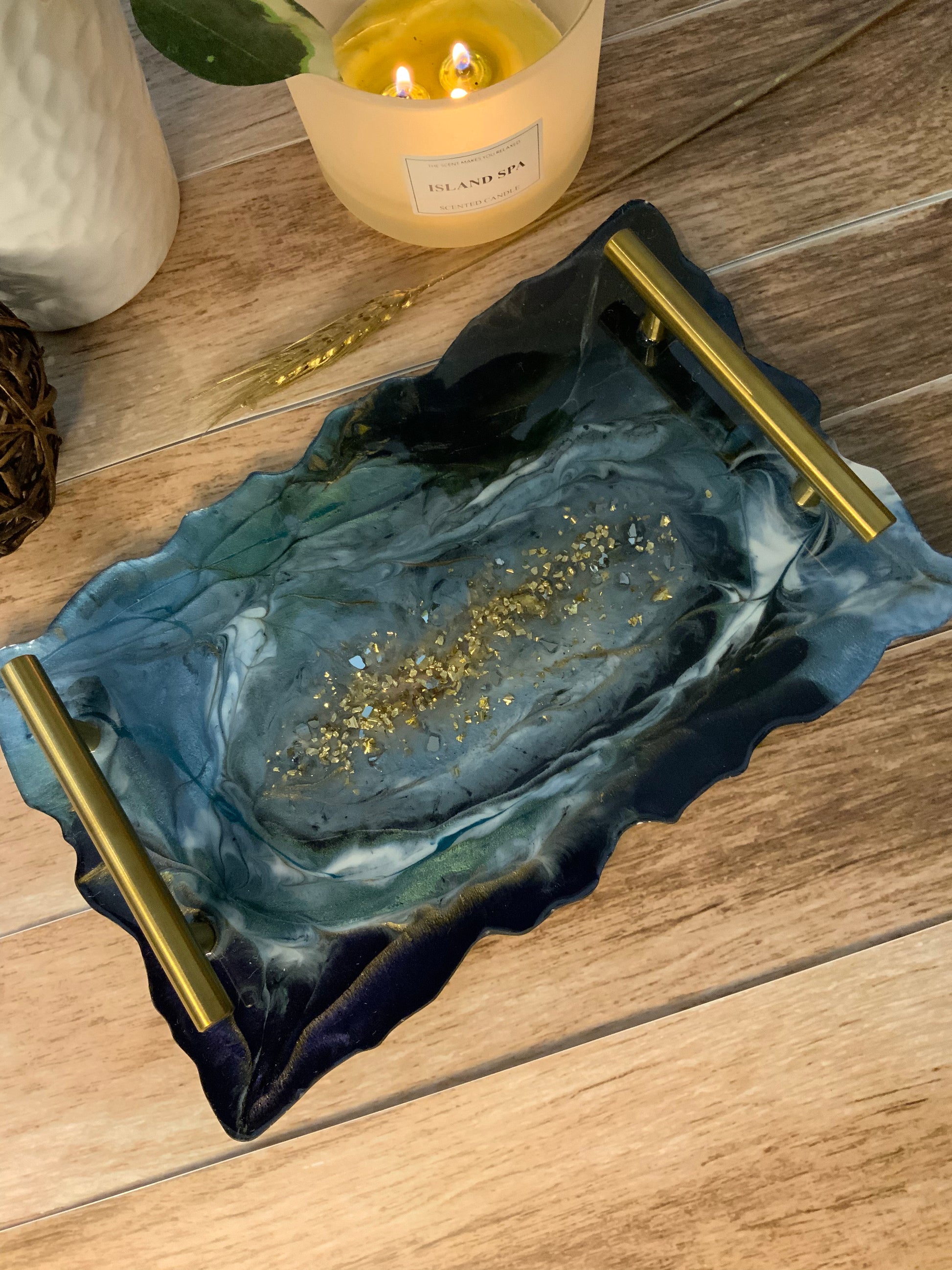Original Bandeja en Resina, en colores azules, verdes, dorados, ocres y oro. Estos colores son inspirados en los minerales y piedras preciosas, que simbolizan a la Riqueza y a la Prosperidad. Estos diseños llevan finas líneas doradas y foil de oro en las orillas o en el centro de la pieza.