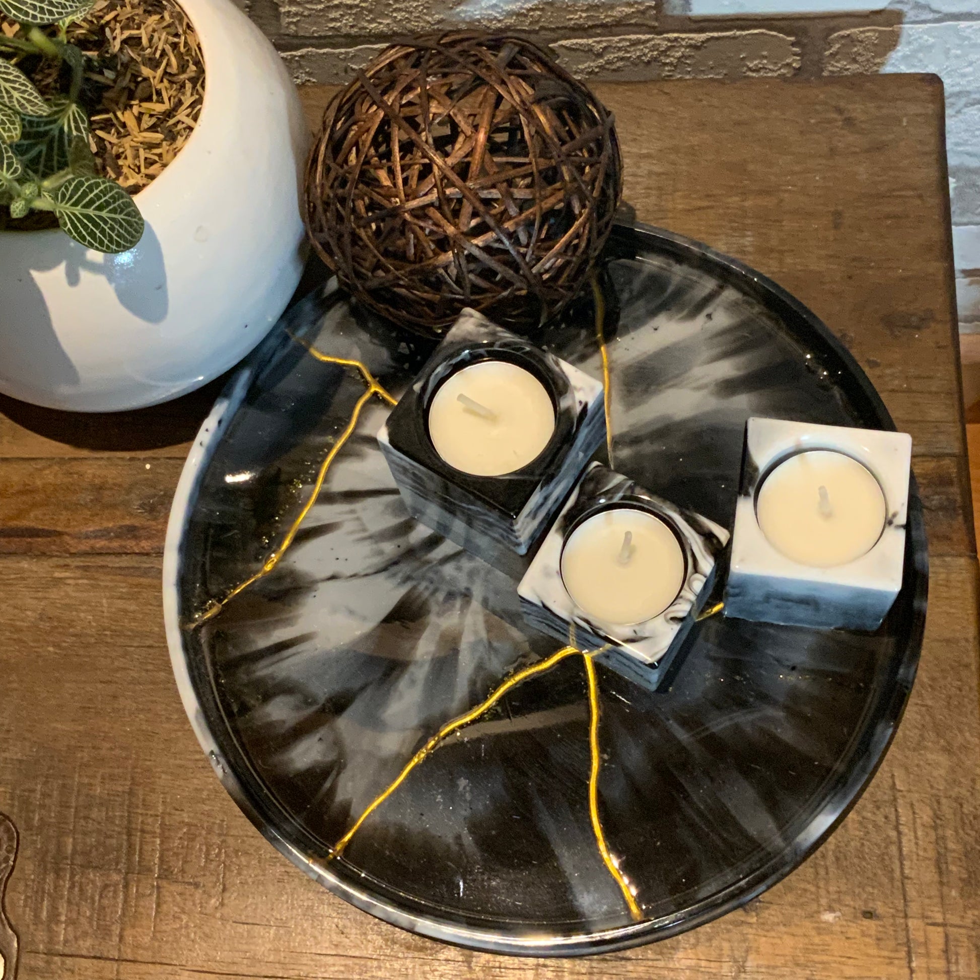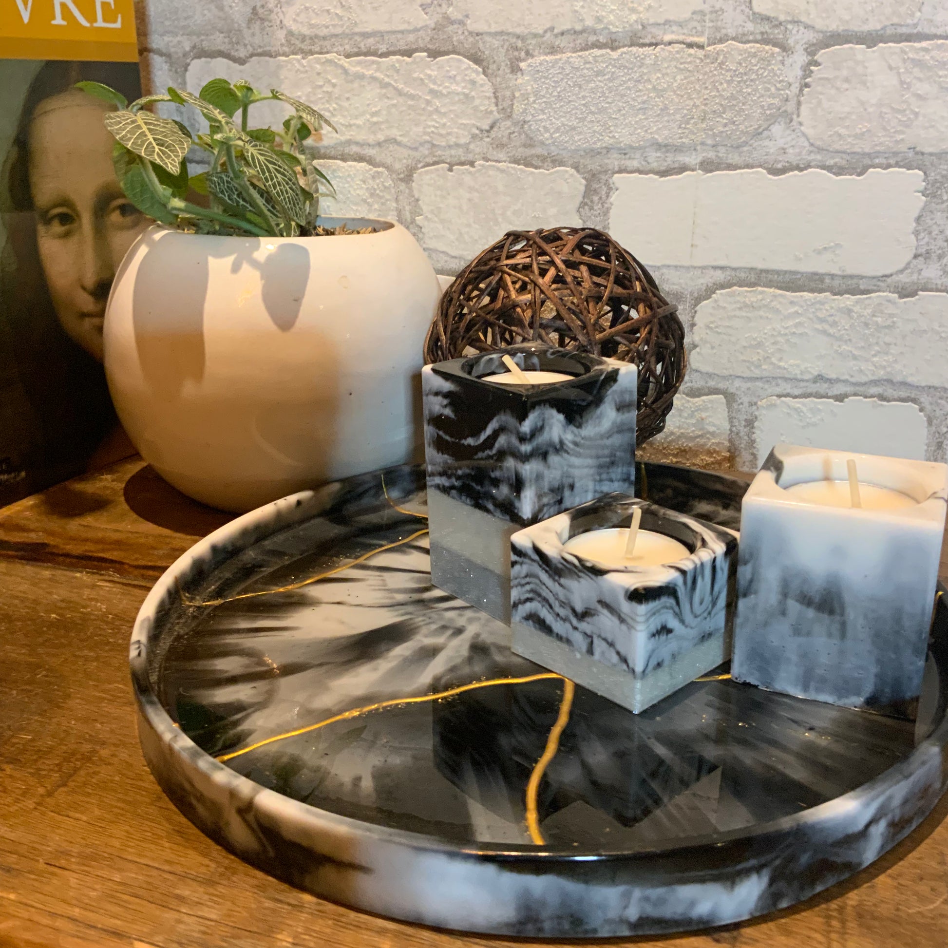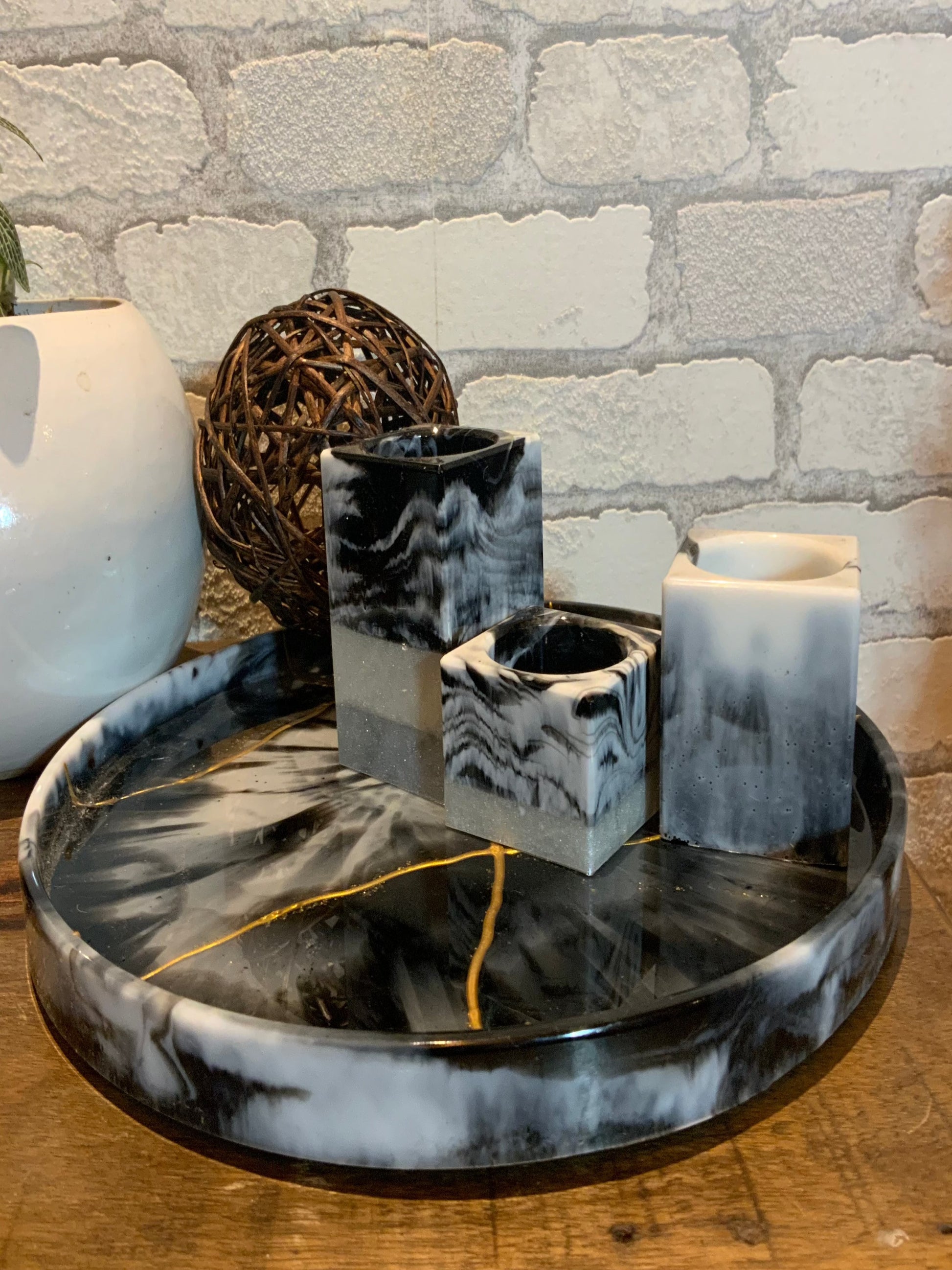 Set de Base y Candelabros en Diseños Únicos, hechos en 100% resina para decorar cualquier lugar especial de tu casa. Regálate un momento de relax con tus velas y con el cuidado de tenerlas en un porta velas para tu seguridad 🏷