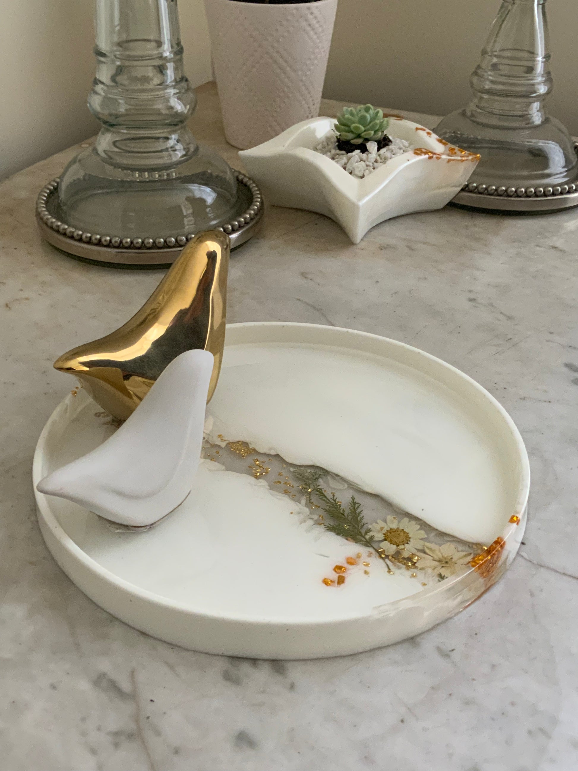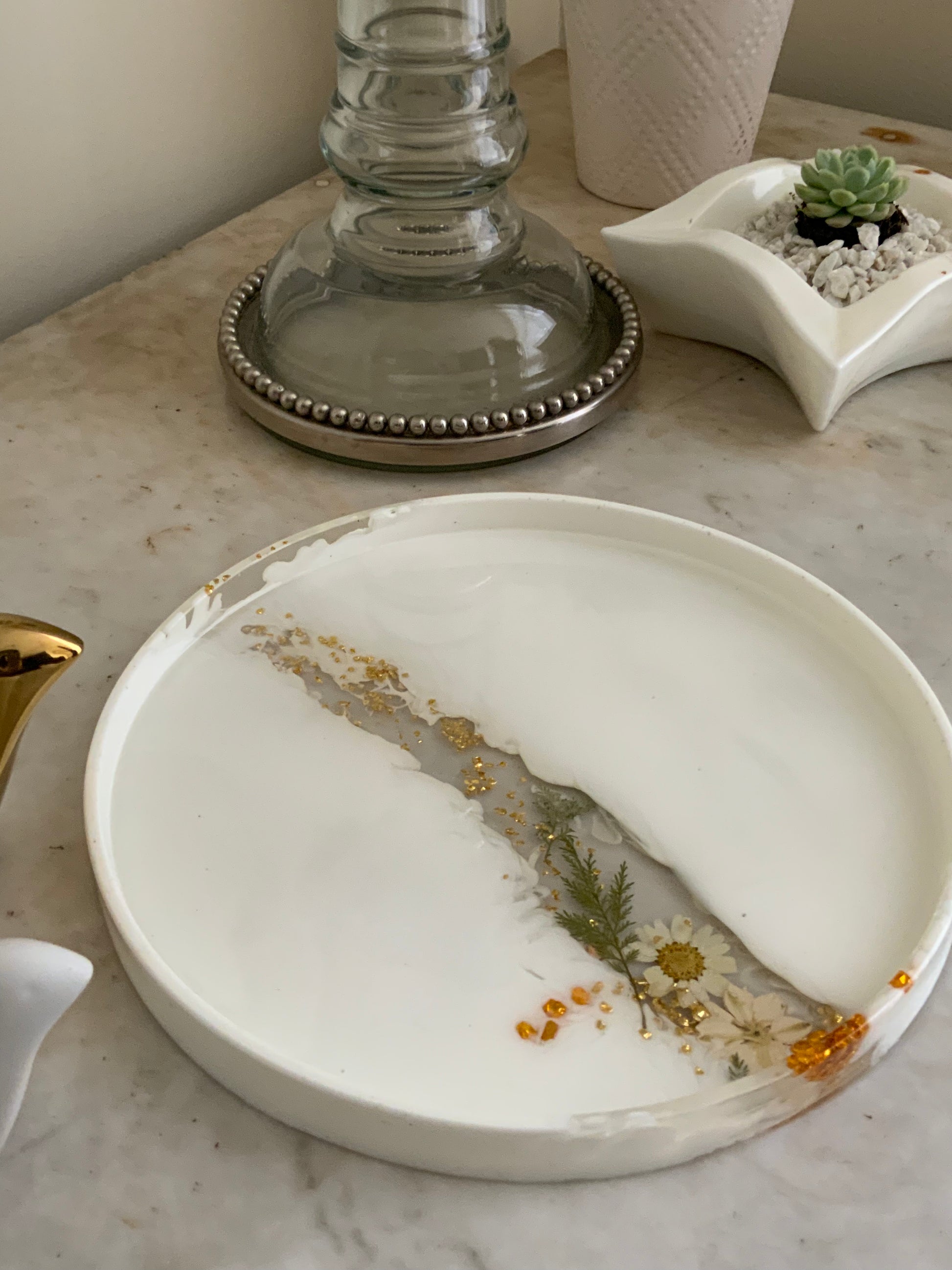 Radiantes Bandejas Decorativas hechas en resina Epoxica, Flores Naturales, Asas de Lujo perfectas para decorar tus espacios, habitación, mesas auxiliares, cocina y hasta para servir.
