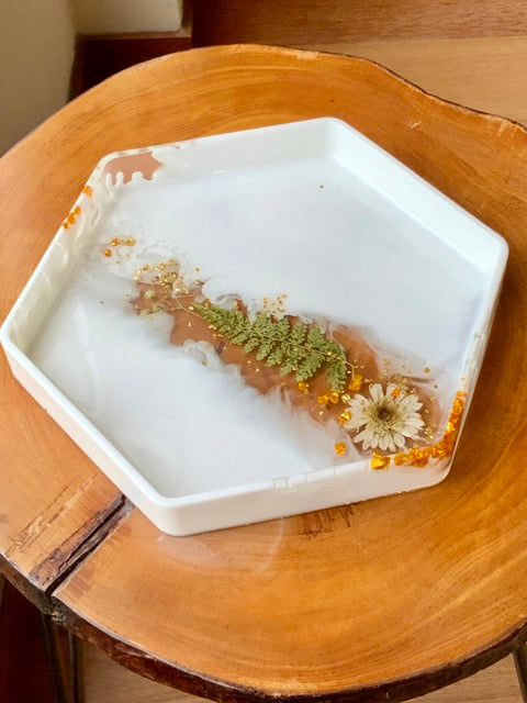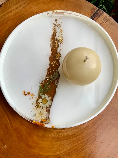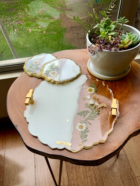 Radiantes Bandejas Decorativas hechas en resina Epoxica, Flores Naturales, Asas de Lujo perfectas para decorar tus espacios, habitación, mesas auxiliares, cocina y hasta para servir.