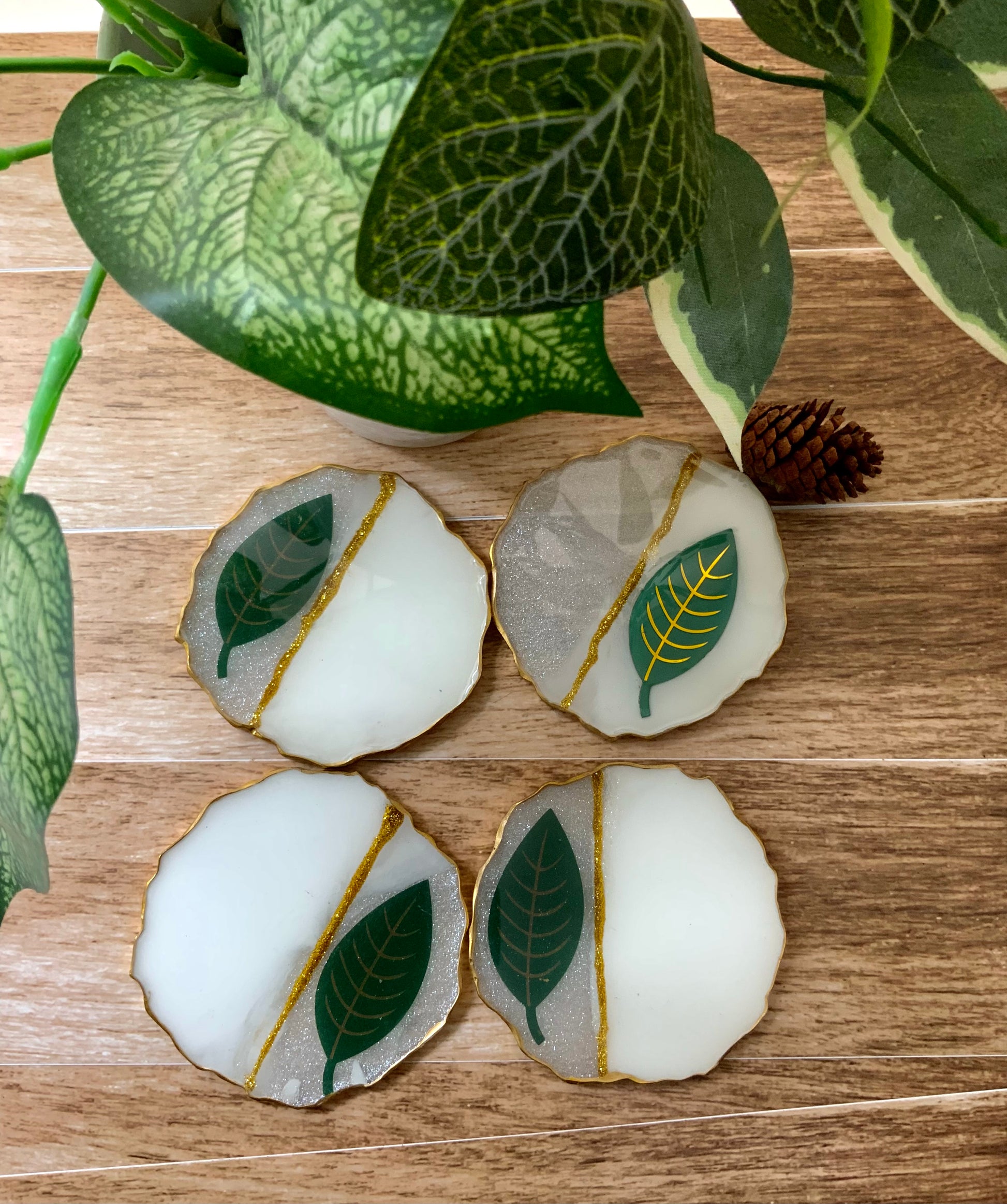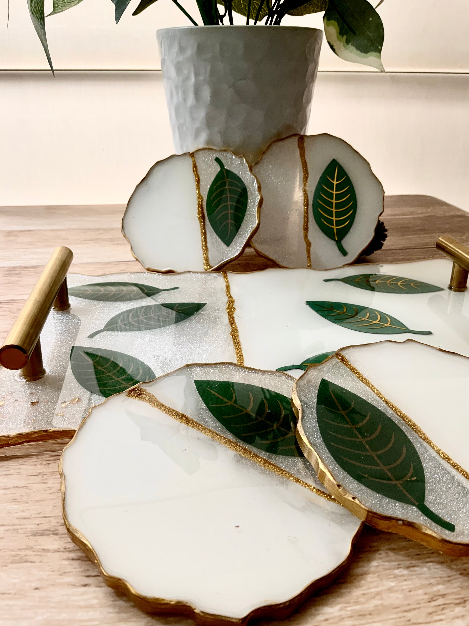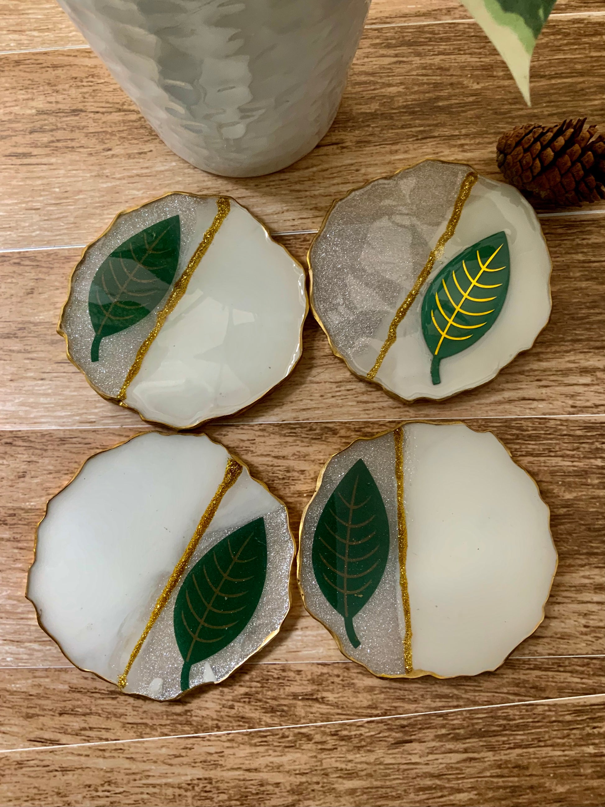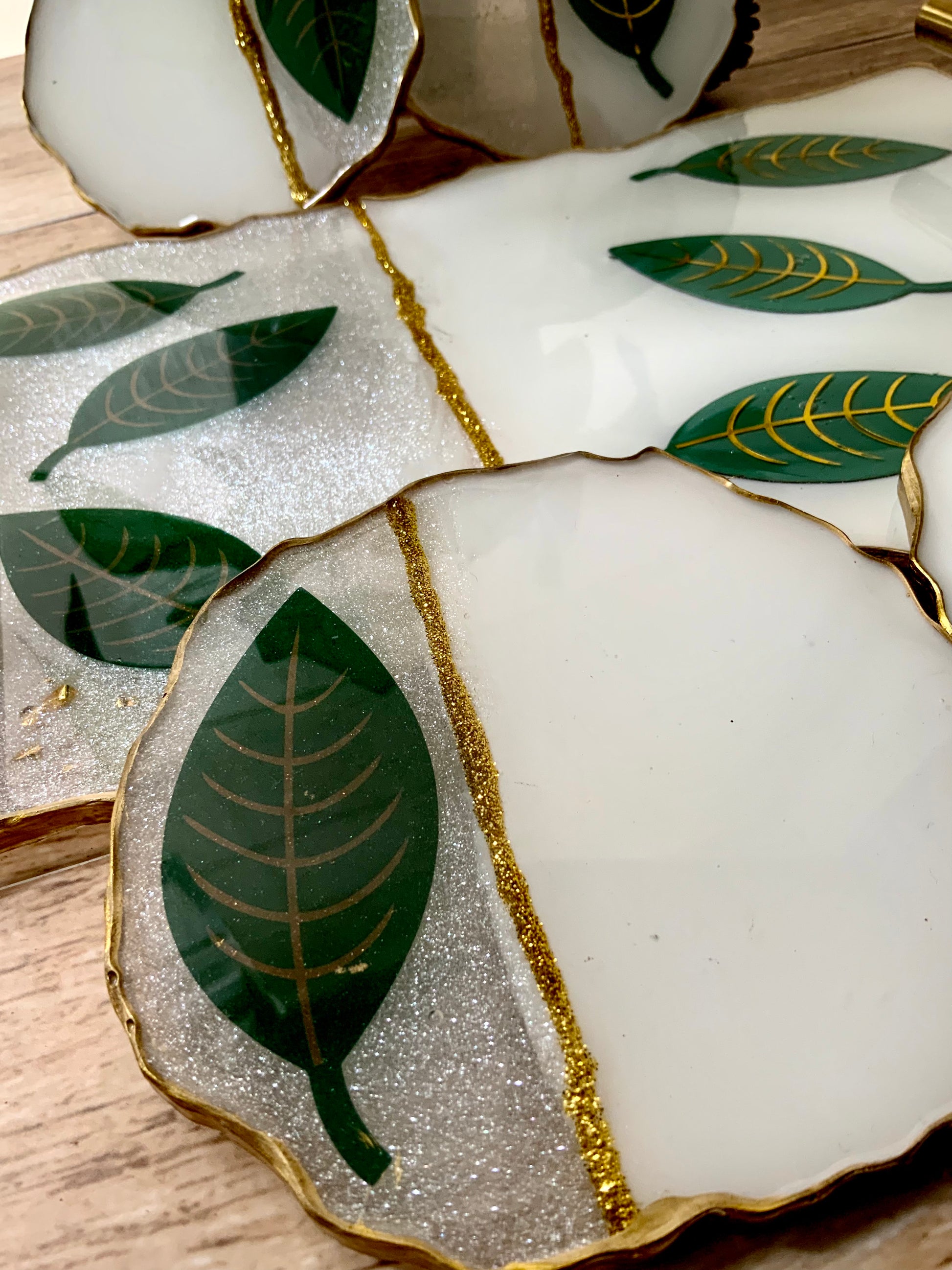 Hermosos Portavasos hechos Resina en color Verde Aguamarina, con piedras y cristales. Bordes pintados a manos color oro 24 k. Puedes personalizar este diseño con los colores de tu preferencia.