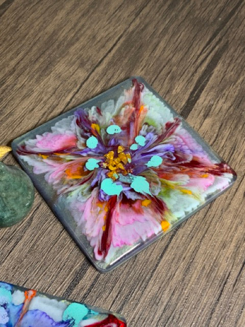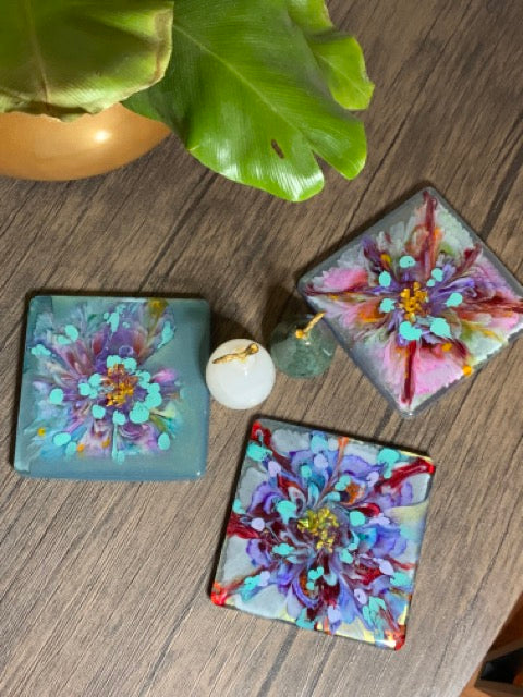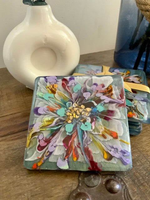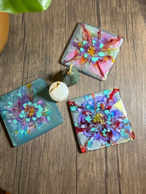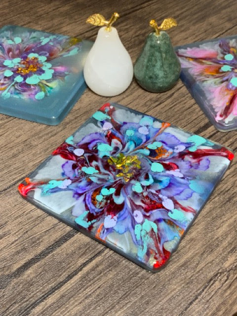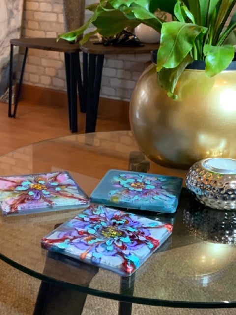 Hermosos Portavasos hechos en Resina en diversos colores, bajo una técnica de aplicación de pigmentos líquidos, que logran un efecto final muy artístico en este diseño. En su centro estan adornados con piedras y cristales dorados. Los bordes son pintados a mano en color oro 24 k.