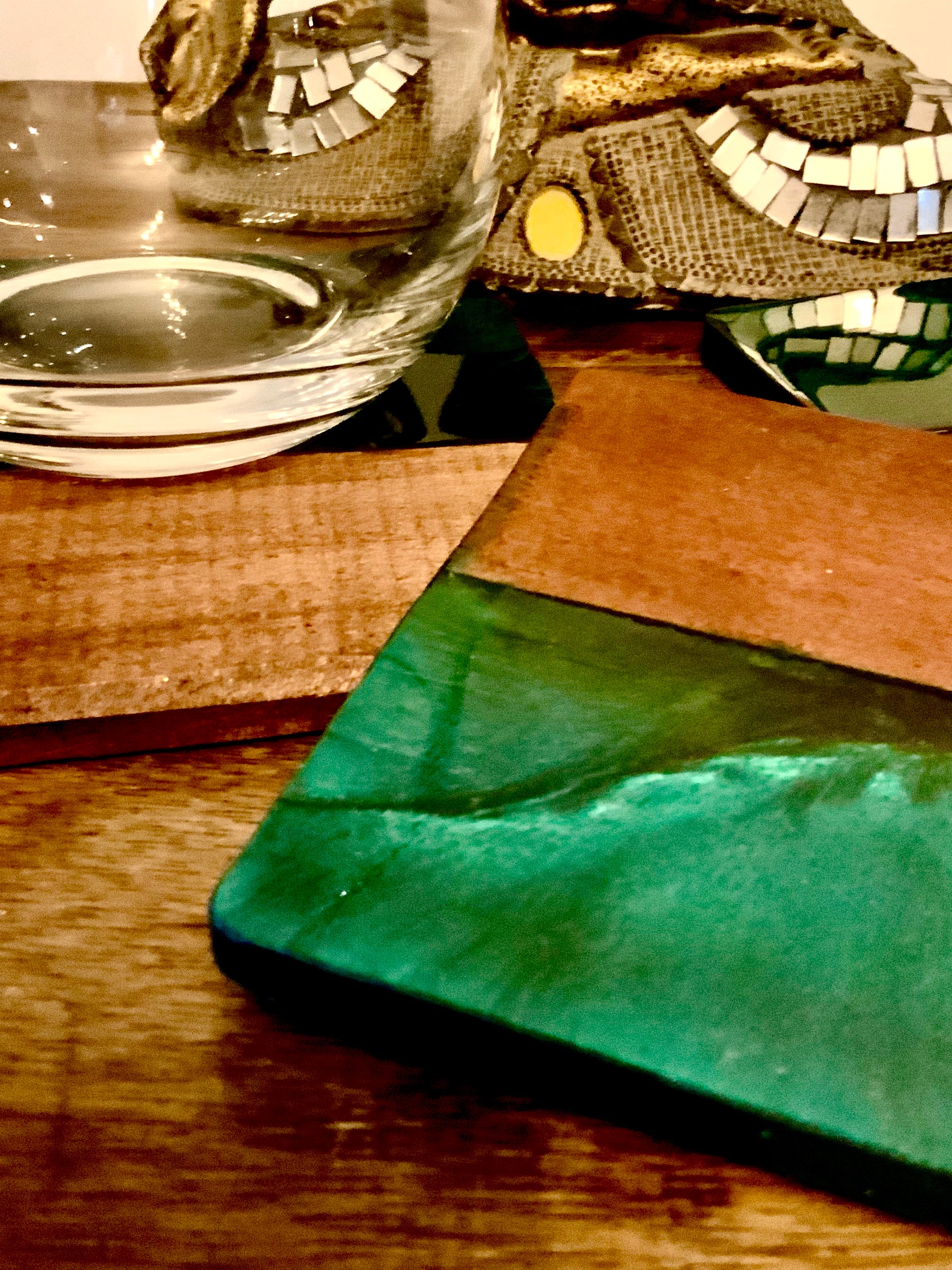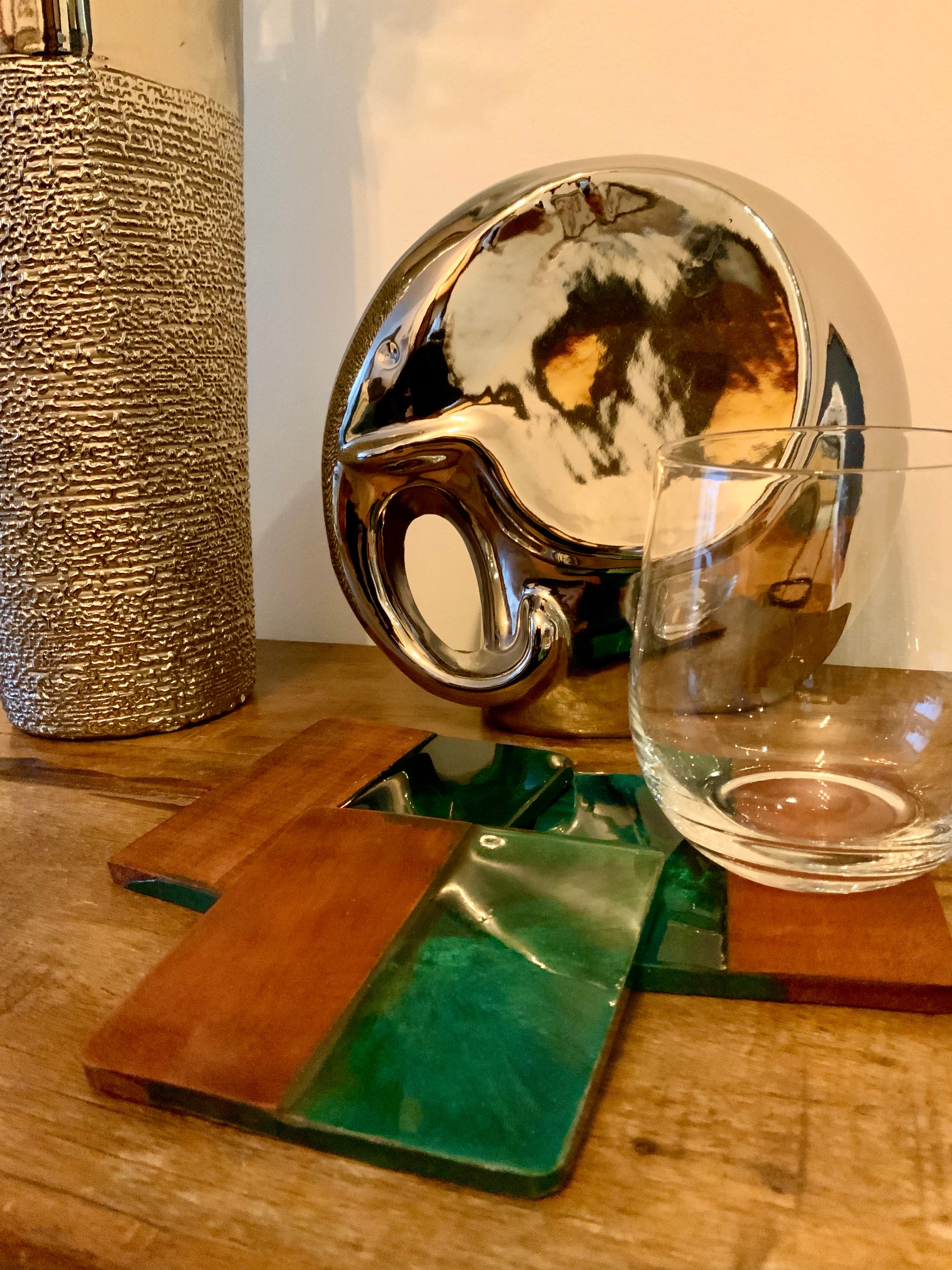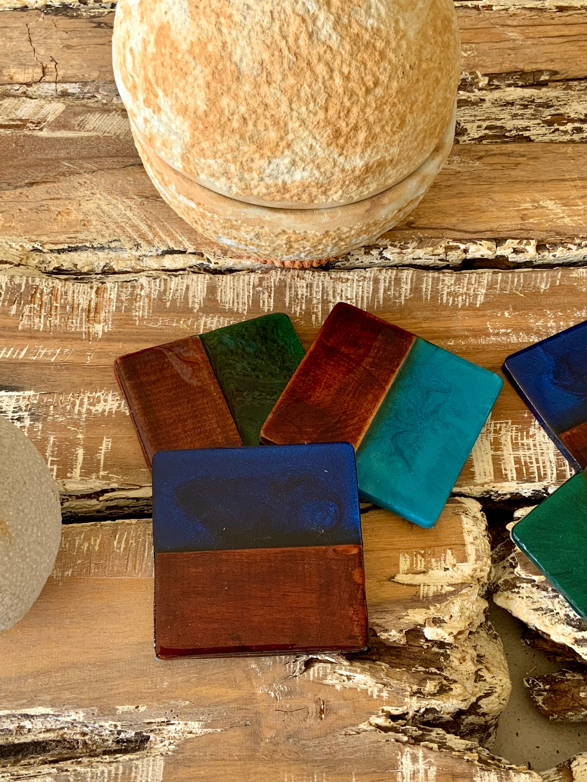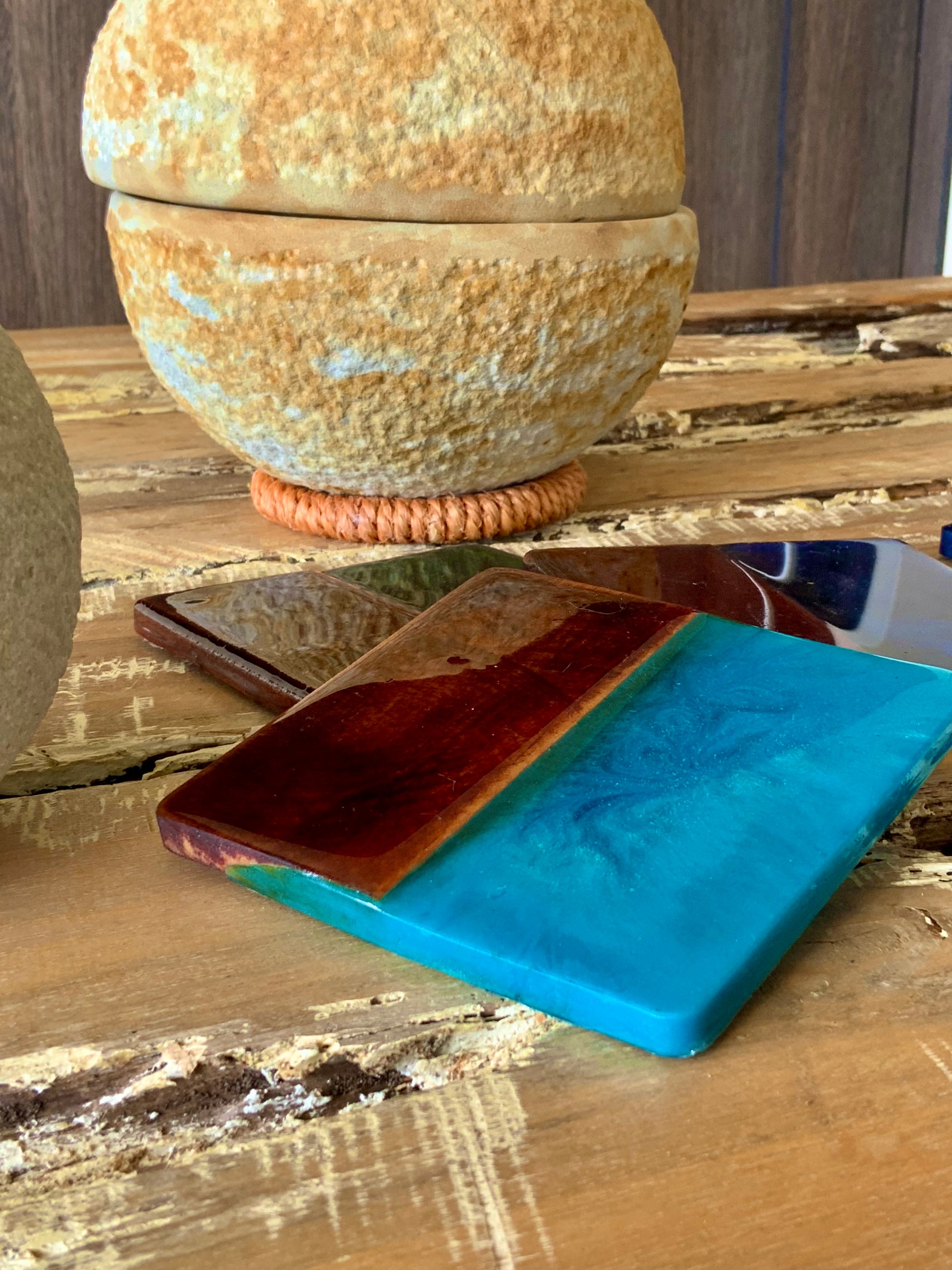 Hermosos Portavasos hechos Resina y Madera en colores clásicos metalizados, hecho en resina con una incrustación de madera en pino para darle un toque único al diseño.