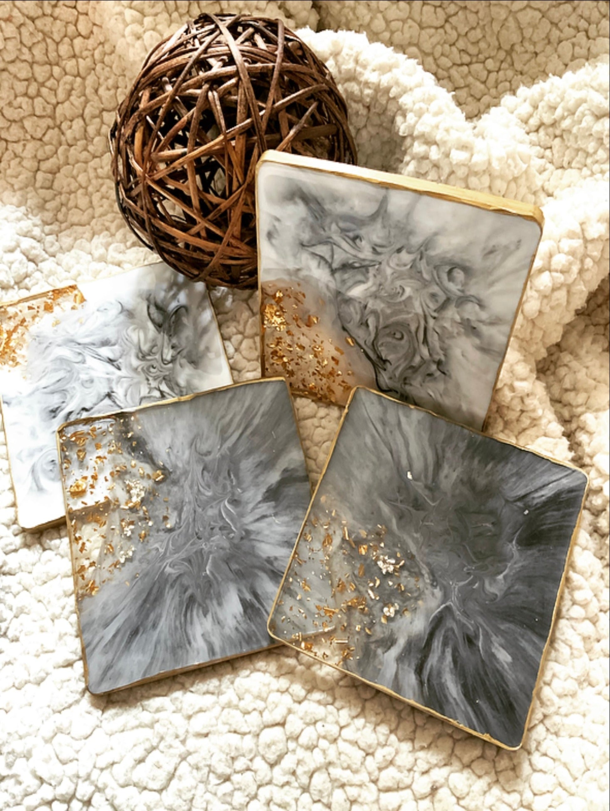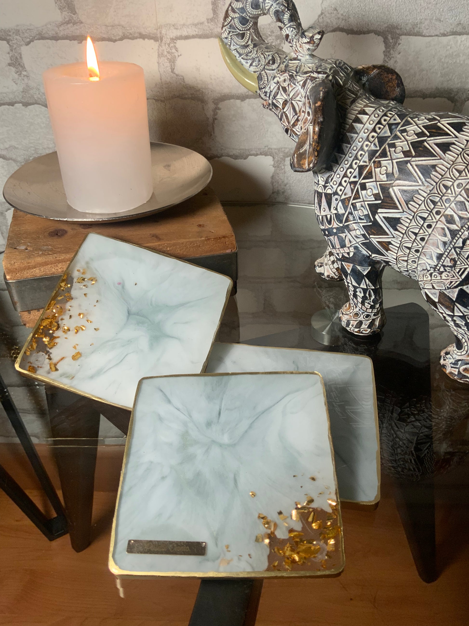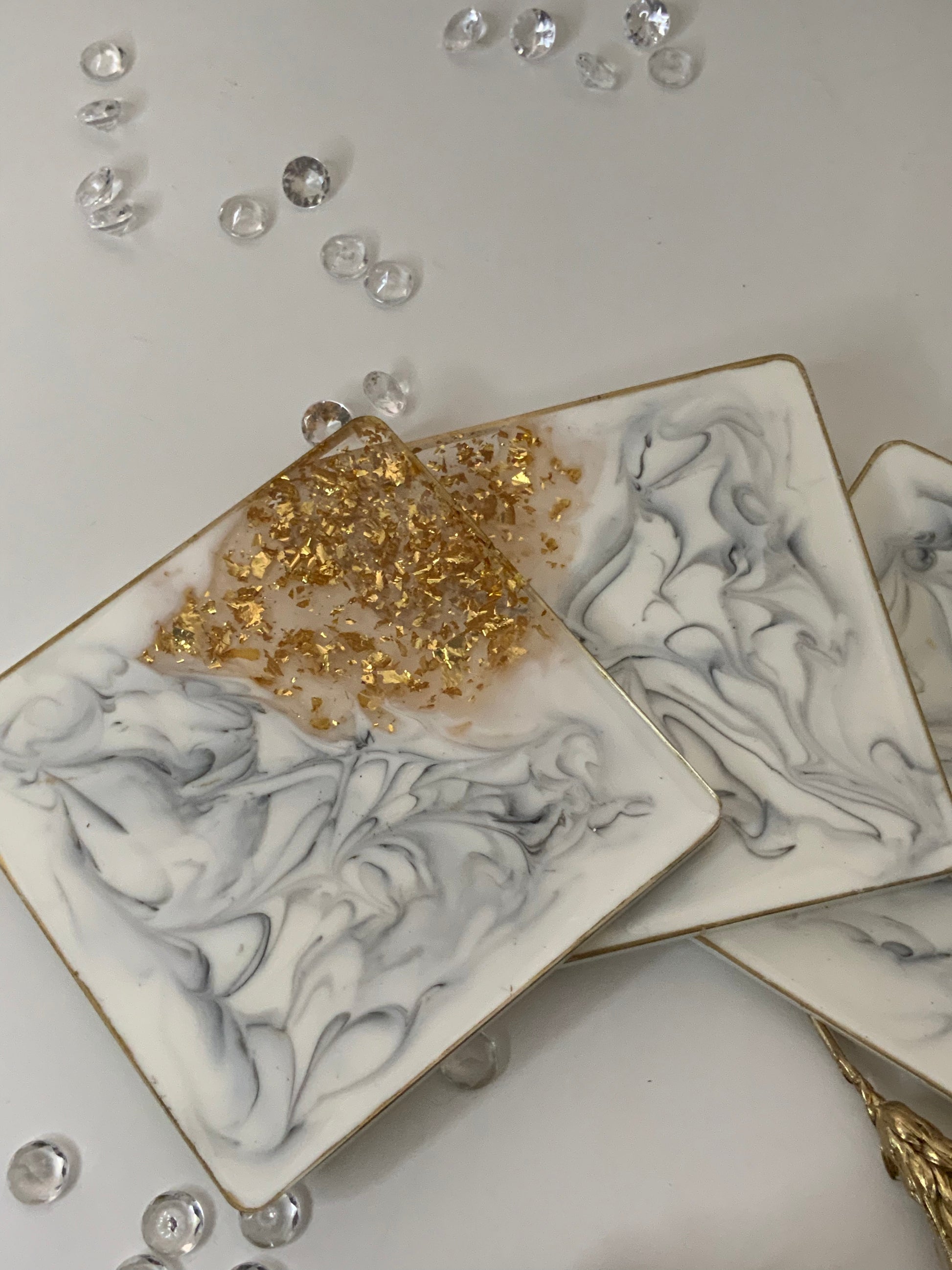 Lujosos Portavasos en Resina que emualn la belleza del Mármol. Los puedes tener en Blanco, negro, gris. Estos diseños llevan finas líneas doradas y foil de oro en las orillas.