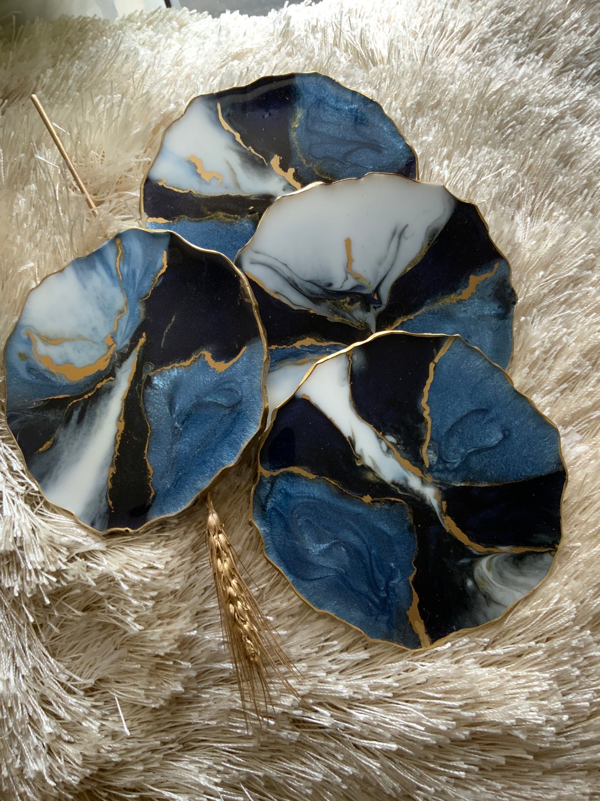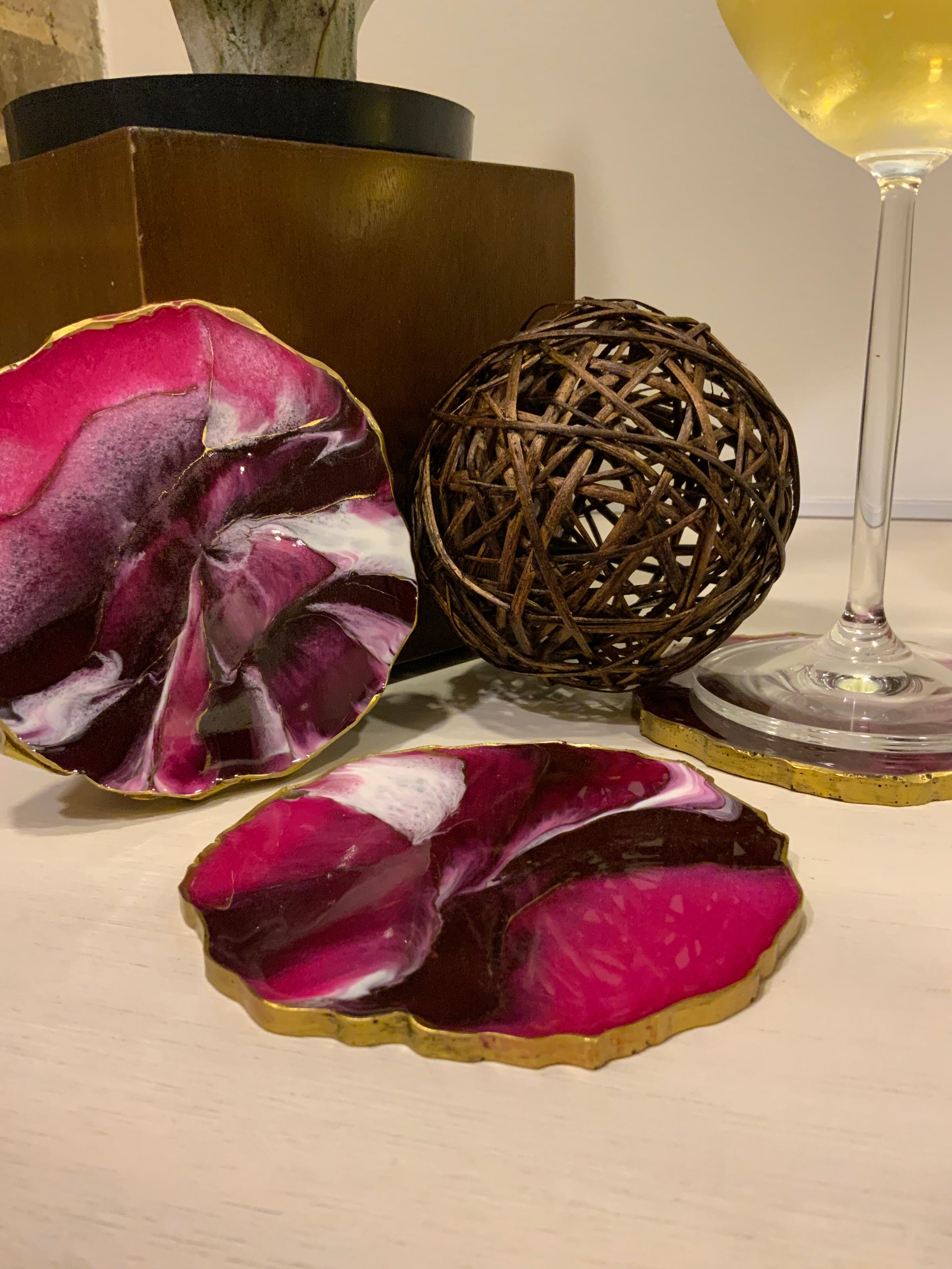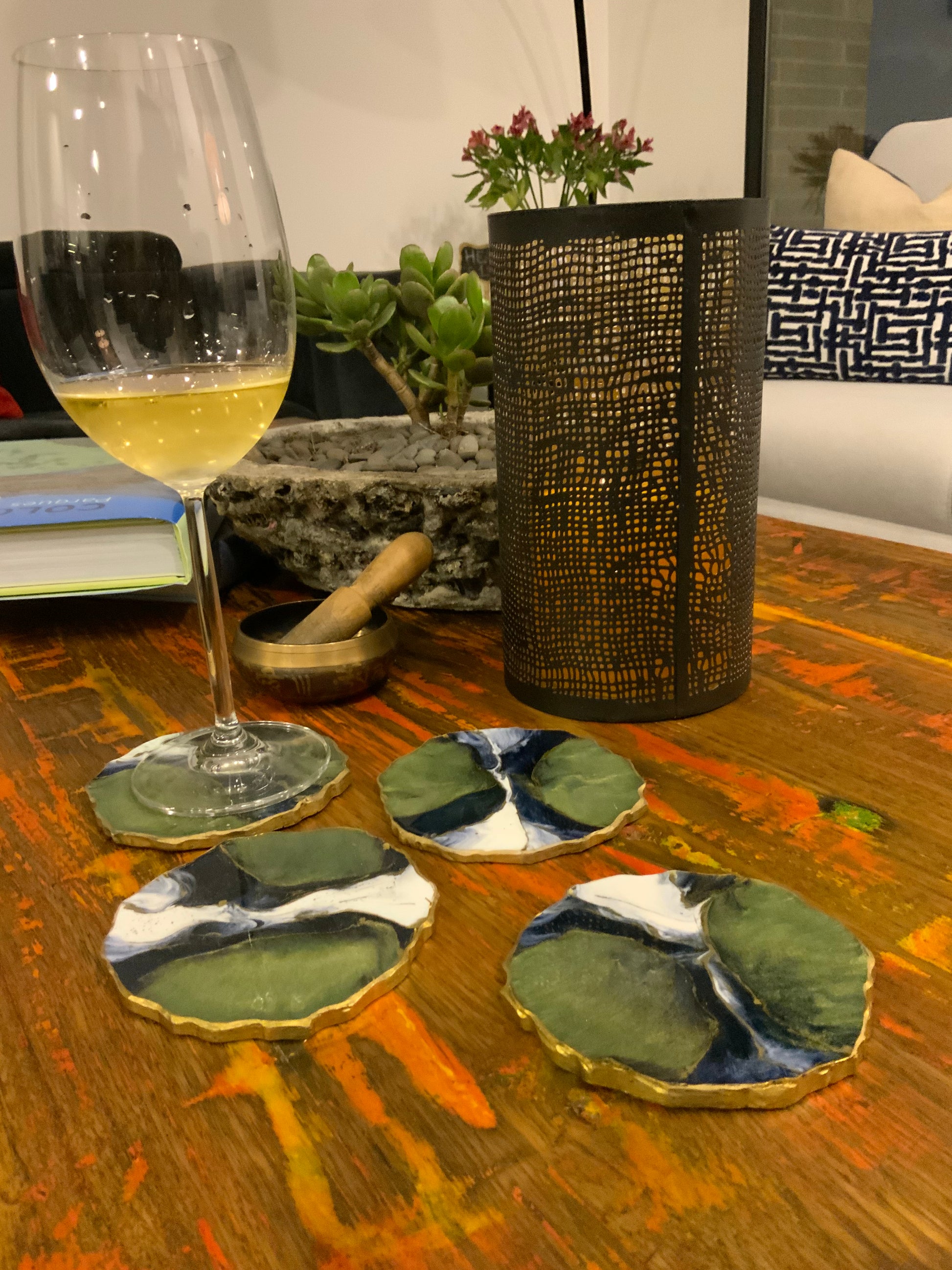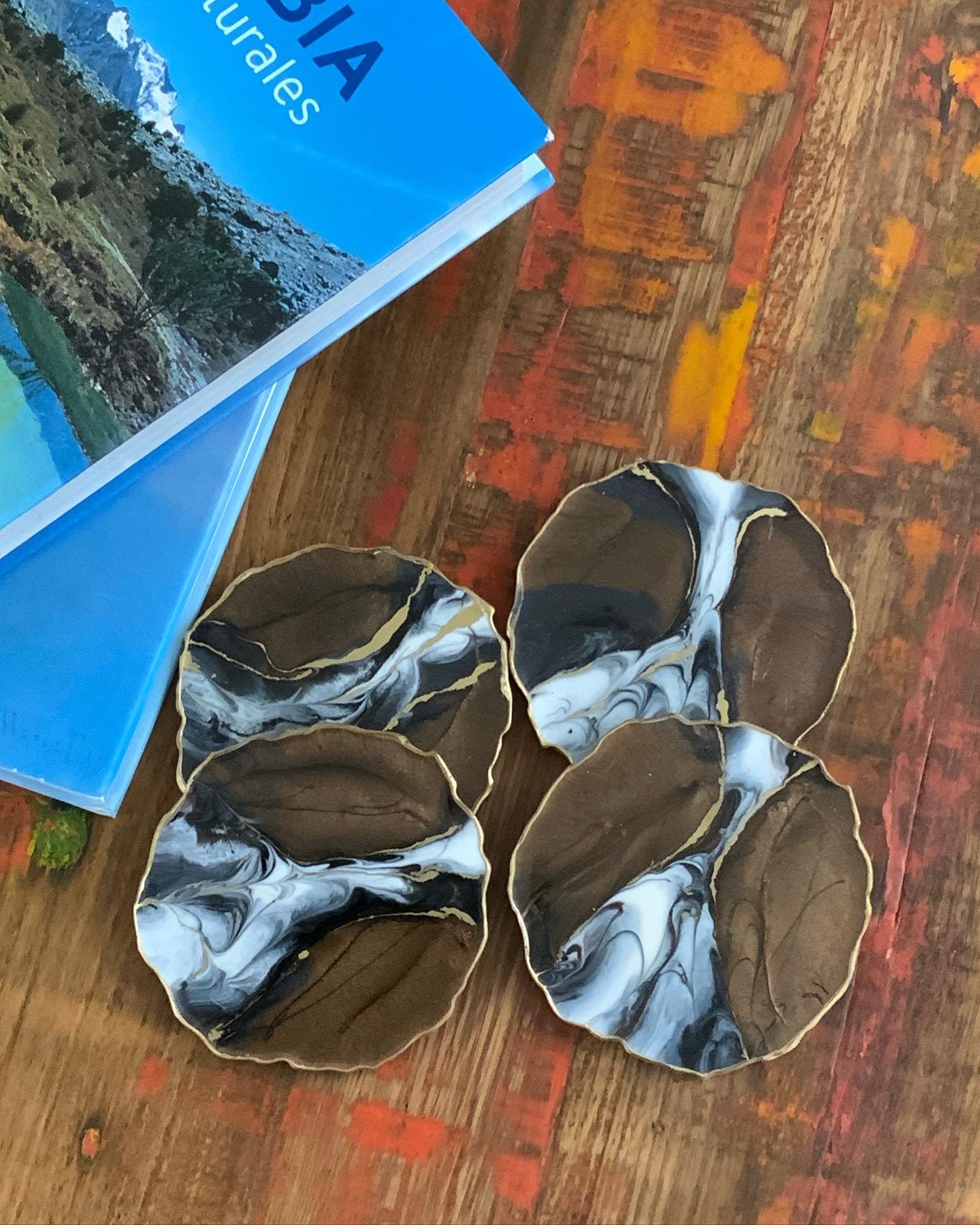 Hermosos Portavasos RIÜ hechos Resina en colores clásicos, combinados con Blanco y líneas doradas.