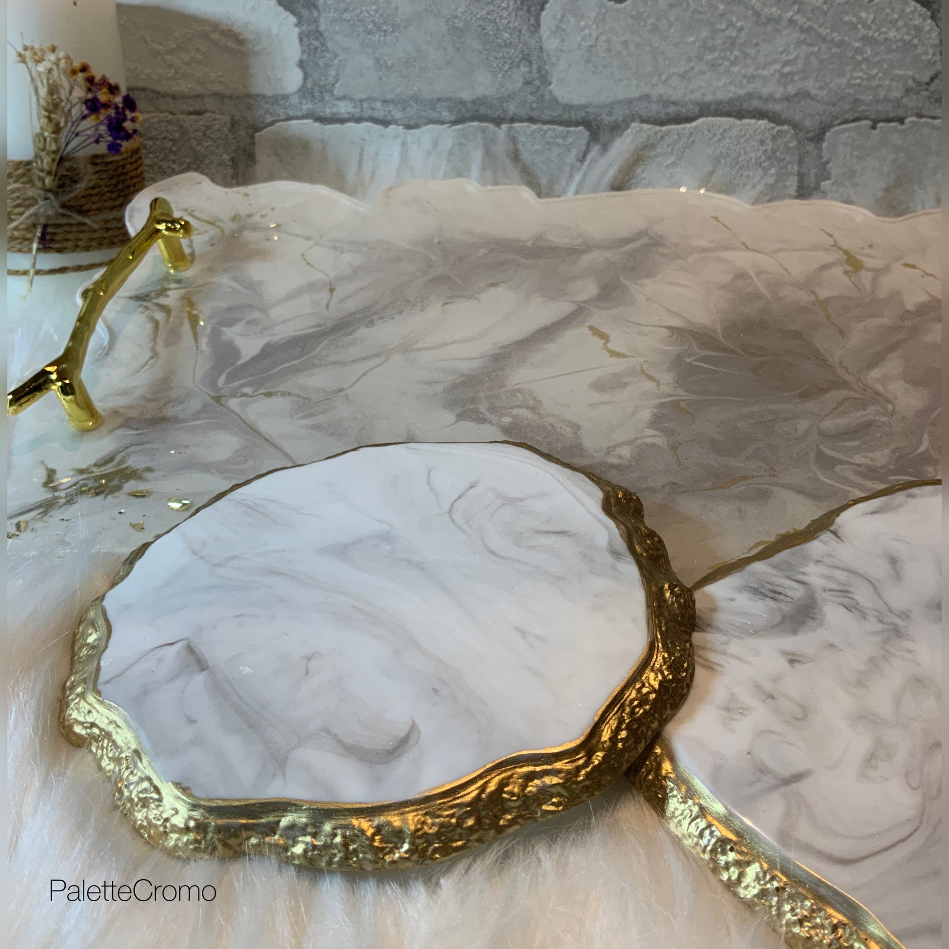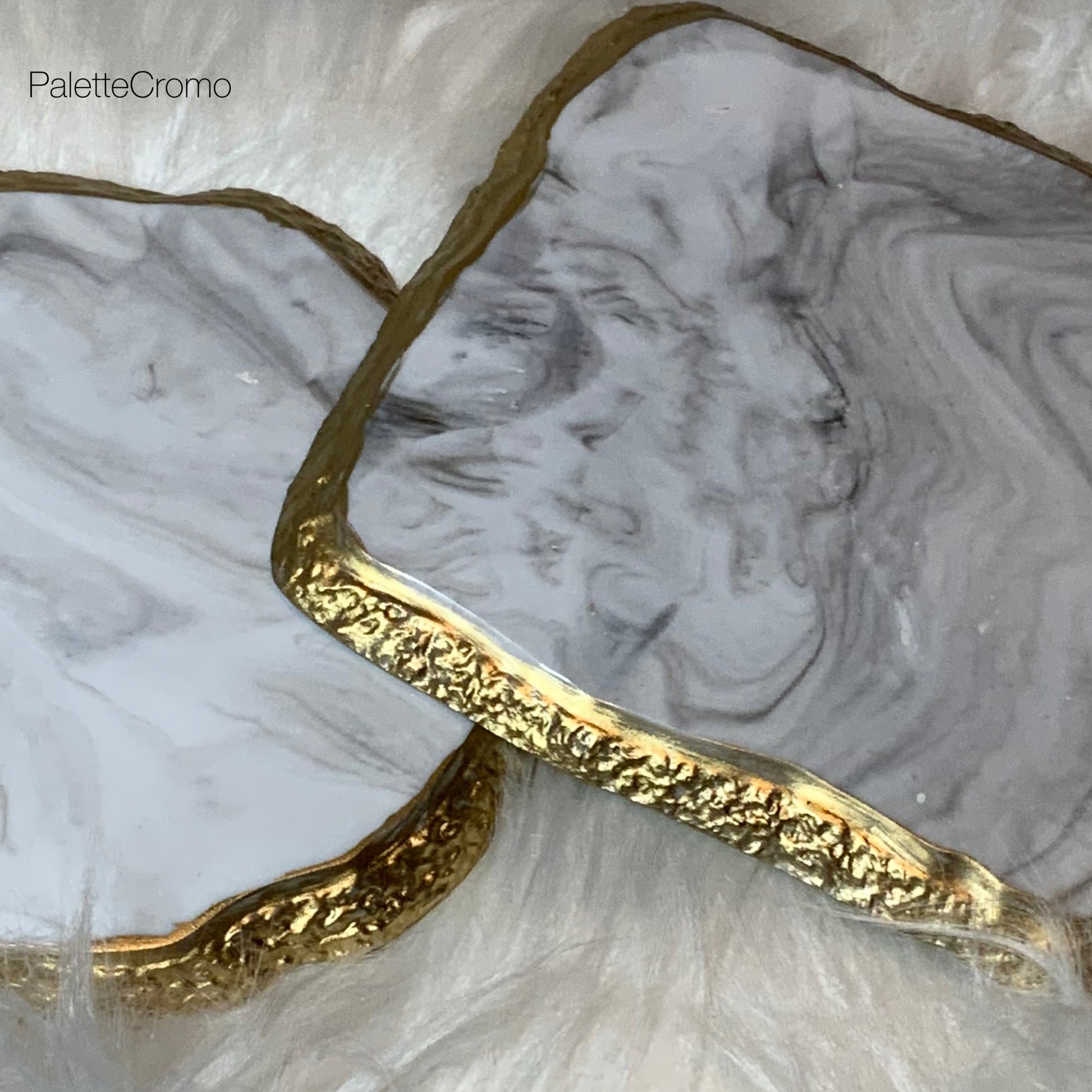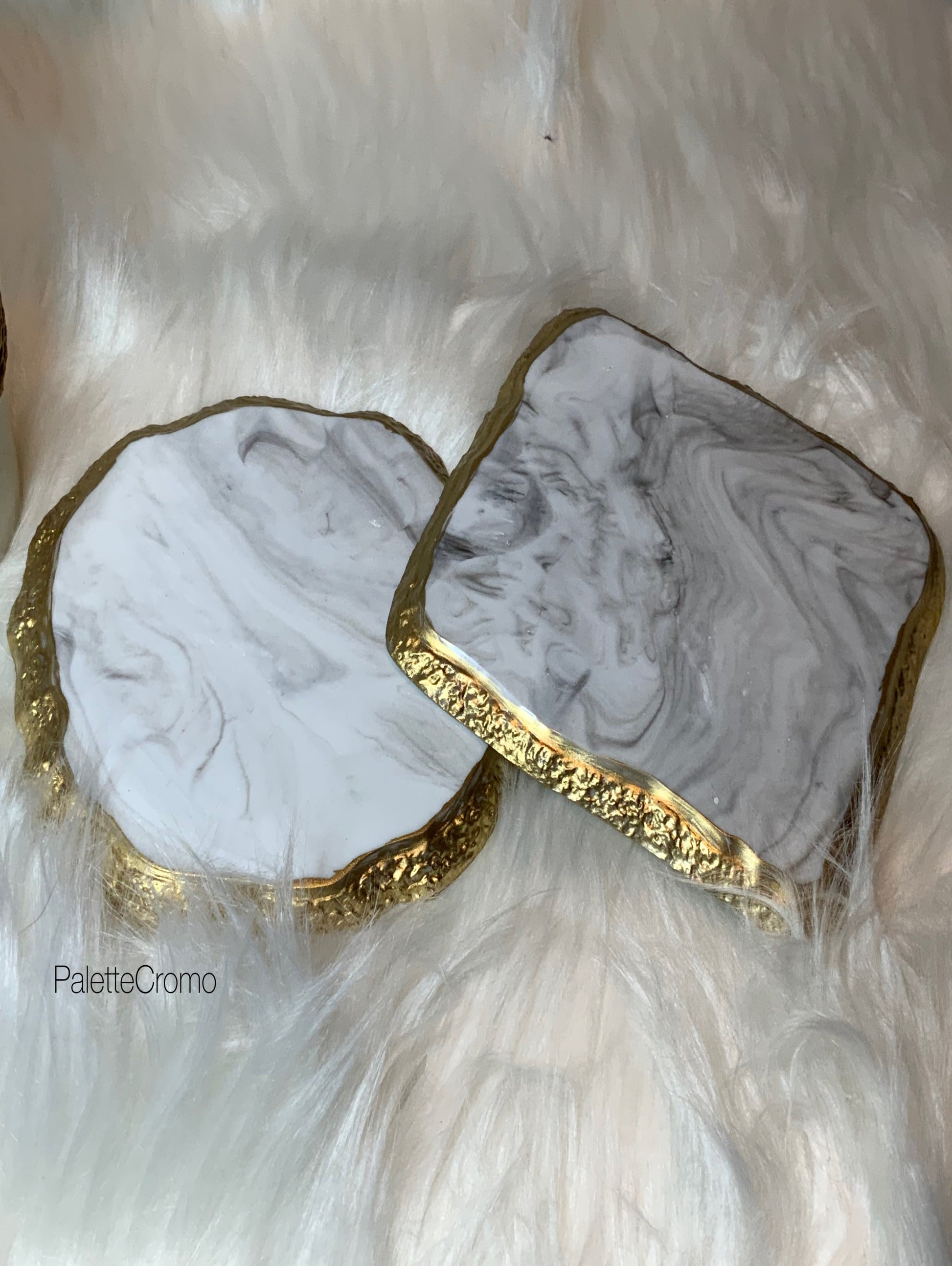Lujosos Portavasos en Resina que evocan la belleza del Mármol. Los puedes tener en Blanco, negro, gris. Estos diseños llevan finas líneas doradas y bordes pintados a mano con pintura de oro metalizada ✔️