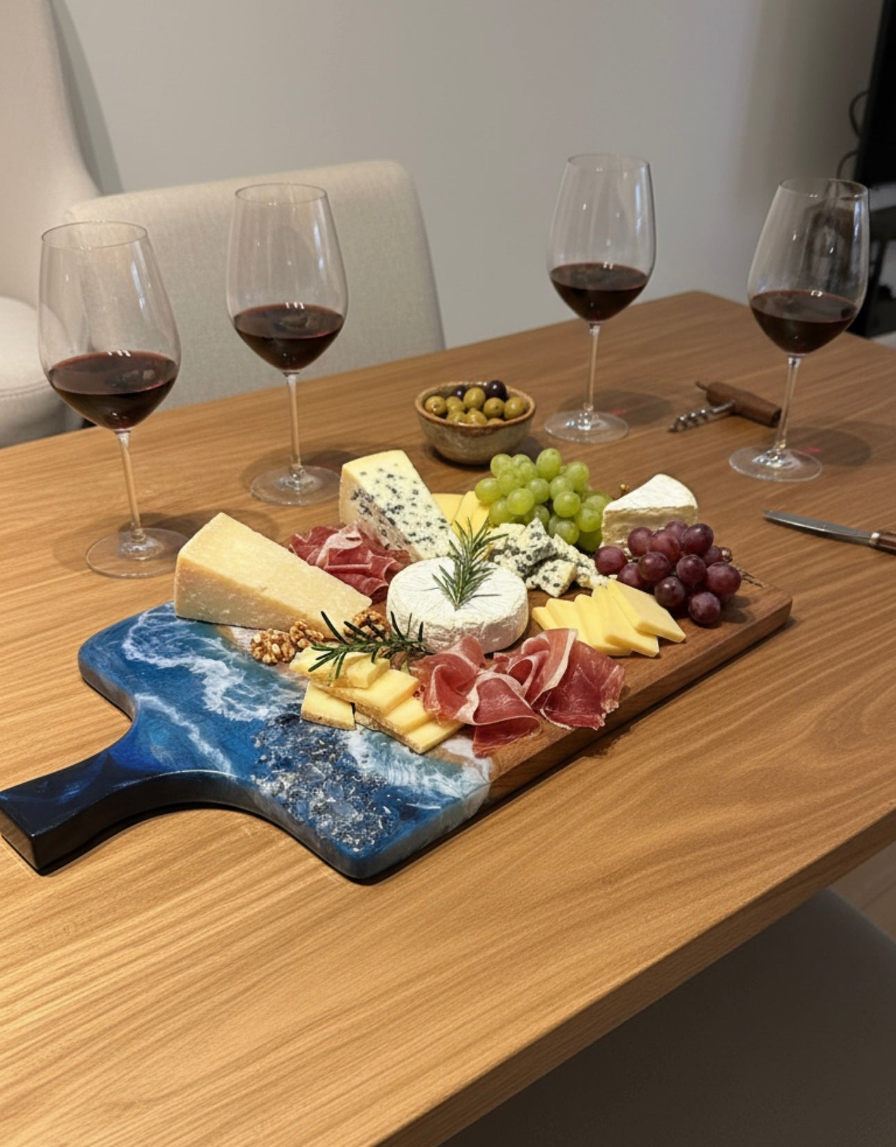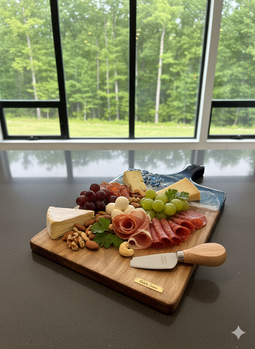 Tablas en Madera de Pino con decoración en Resina y piedras Turcas en azul marino. Perfectas para Decorar tus espacios y reuniones, ideales para colocar quesos y charcuterías.