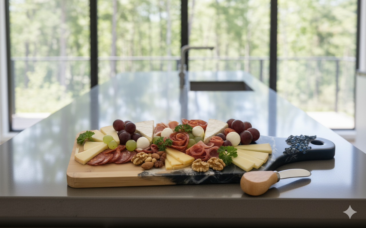 Tablas en Madera de Pino con decoración en Resina y piedras Turcas en azul marino. Perfectas para Decorar tus espacios y reuniones, ideales para colocar quesos y charcuterías.